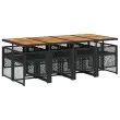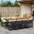 Ta vrtna jedilna garnitura je odlična izbira za večerjo na prostem ali za sprostitev na vrtu, dvorišču ali terasi. Vzdržljiv material: PE ratan, znan tudi kot poli ratan, je močan sintetični material, ki zahteva malo vzdrževanja in je videti kot naravni ratan. Je lahek, enostaven za čiščenje in se zaradi svoje vzdržljivosti in odpornosti na vremenske vplive pogosto uporablja za zunanje pohištvo. Stabilna mizna plošča, ki je enostavna za čiščenje: Ta vrtna miza ima ploščo iz akacijevega lesa, ki je čvrsta, vzdržljiva in jo je enostavno čistiti z vlažno krpo. Kompaktno shranjevanje: Te stole je mogoče zložiti, zato jih je enostavno shraniti pod mizo. Ko so zloženi, se lepo prilegajo pod mizo in tvorijo prostorsko varčno kocko. Udobno sedenje: To zunanje pohištvo z debelo oblazinjenimi blazinami zagotavlja udobno sedenje. Prevleko je mogoče odstraniti in oprati: Te sedežne blazine imajo odstranljive prevleke za lažje pranje in vzdrževanje. Prevleke za blazine za stole imajo na zadnji strani zavihek za enostavno pritrditev na stole. Dobro je vedeti:Če želite, da vaše zunanje pohištvo ostane lepo, vam priporočamo, da ga zaščitite z vodoodporno prevleko.Maksimalna nosilnost (na sedež): 110 kgUV-odpornoPotrebno sestavljanje: DaMiza:Barva: ČrnaMaterial: PE ratan, prašno premazano jeklo, trden akacijev les z oljnim premazomDimenzije: 220 x 106 x 73 cm (D x Š x V)Stol:Barva: ČrnaMaterial: PE ratan, jeklen okvir s prašnim premazomDimenzije vrtnega stola: 50,5 x 54 x 79 cm (Š x G x V)Velikost sedeža: 45 x 38 cm (Š x G)Višina sedišča, merjena od tal: 43 cmVišina naslonjala za roke, merjena od tal: 64 cmBlazina:Barva: Kremno belaMaterial prevleke: Tkanina (100 % poliester)Material polnila: PenaDimenzije blazine za stol: 76 x 46 x 2 cm (D x Š x D)Dimenzije blazine za stolček: 40 x 40 x 2 cm (Š x G x D)Paket vsebuje:1 x Vrtna miza8 x Vrtni stol8 x Blazina za stol z visokim naslonom s snemljivo in pralno prevleko 3210747