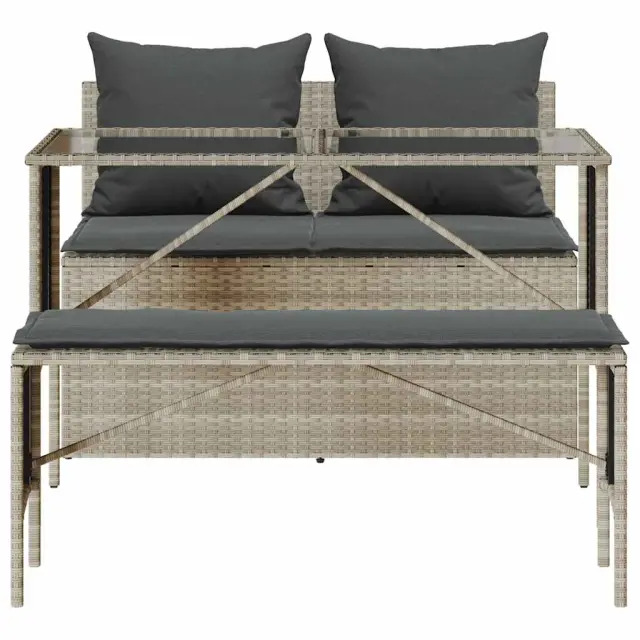 Ta vrtna jedilna garnitura je odlična izbira za večerjo na prostem ali za sprostitev na vrtu, dvorišču ali terasi. Trpežen material: PE ratan, znan tudi kot poli ratan, je močan sintetični material, ki ne potrebuje vzdrževanja in je videti kot naravni ratan. Je lahek, enostaven za čiščenje in se zaradi svoje vzdržljivosti in odpornosti na vremenske vplive pogosto uporablja za zunanje pohištvo.Steklena mizna plošča: Površina zunanje mize je izdelana iz močnega in trpežnega kaljenega stekla, kar omogoča enostavno čiščenje z vlažno krpo in vašemu zunanjemu prostoru doda pridih elegance.Udobno sedenje: To zunanje pohištvo z debelo oblazinjenimi blazinami zagotavlja udobno sedenje.Prevleko je mogoče odstraniti in oprati: Te sedežne blazine imajo odstranljive prevleke za lažje pranje in vzdrževanje.Robusten in stabilen okvir: Prašno barvan jekleni okvir zagotavlja, da je vrtno pohištvo močno in stabilno za vsakodnevno uporabo na prostem. Dobro je vedeti:Če želite, da vaše zunanje pohištvo ostane lepo, vam priporočamo, da ga zaščitite z vodoodporno prevleko.UV-odpornoMaks. nosilnost (na sedež): 110 kgPotrebno sestavljanje: DaMiza:Barva: Svetlo sivaMaterial: PE ratan, jeklo s prašnim premazom, kaljeno stekloDimenzije: 110 x 55 x 72,5 cm (d x š x v)Kavč brez naslonov za roke:Barva: Svetlo sivaMaterial: PE ratan, jeklen okvir s prašnim premazomDimenzije: 110 x 59 x 75 cm (Š x G x V)Velikost sedeža: 110 x 55 cm (Š x G)Višina sedeža od tal (brez blazine): 44 cmDolgi stolček:Barva: Svetlo sivaMaterial: PE ratan, jeklen okvir s prašnim premazomDimenzije: 105 x 30 x 42 cm (širina x globina x višina)Blazina:Barva: Temno sivaMaterial prevleke: Tkanina (100 % poliester)Polnilo sedežne blazine: PenaMaterial za polnjenje hrbtne blazine Material: vlakna PPDimenzije sedežne blazine (kavč): 100 x 55 x 3 cm (Š x G x T)Dimenzije sedežne blazine (stolček): 105 x 30 x 3 cm (Š x G x T)Dimenzije hrbtne blazine: (D x Š x T): 54 x 43 x 12 cm.Paket vsebuje:1 x Miza1 x Kavč brez naslonjal za roke1 x Dolg stolček2 x Sedežna blazina s snemljivo pralno prevleko2 x Blazina za hrbet 4104186