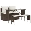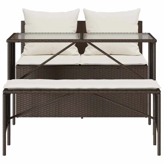 Ta vrtna jedilna garnitura je odlična izbira za večerjo na prostem ali za sprostitev na vrtu, dvorišču ali terasi. Trpežen material: PE ratan, znan tudi kot poli ratan, je močan sintetični material, ki ne potrebuje vzdrževanja in je videti kot naravni ratan. Je lahek, enostaven za čiščenje in se zaradi svoje vzdržljivosti in odpornosti na vremenske vplive pogosto uporablja za zunanje pohištvo.Steklena mizna plošča: Površina zunanje mize je izdelana iz močnega in trpežnega kaljenega stekla, kar omogoča enostavno čiščenje z vlažno krpo in vašemu zunanjemu prostoru doda pridih elegance.Udobno sedenje: To zunanje pohištvo z debelo oblazinjenimi blazinami zagotavlja udobno sedenje.Prevleko je mogoče odstraniti in oprati: Te sedežne blazine imajo odstranljive prevleke za lažje pranje in vzdrževanje.Robusten in stabilen okvir: Prašno barvan jekleni okvir zagotavlja, da je vrtno pohištvo močno in stabilno za vsakodnevno uporabo na prostem. Dobro je vedeti:Če želite, da vaše zunanje pohištvo ostane lepo, vam priporočamo, da ga zaščitite z vodoodporno prevleko.UV-odpornoMaks. nosilnost (na sedež): 110 kgPotrebno sestavljanje: DaMiza:Barva: RjavaMaterial: PE ratan, jeklo s prašnim premazom, kaljeno stekloDimenzije: 110 x 55 x 72,5 cm (d x š x v)Kavč brez naslonov za roke:Barva: RjavaMaterial: PE ratan, jeklen okvir s prašnim premazomDimenzije: 110 x 59 x 75 cm (Š x G x V)Velikost sedeža: 110 x 55 cm (Š x G)Višina sedeža od tal (brez blazine): 44 cmDolgi stolček:Barva: RjavaMaterial: PE ratan, jeklen okvir s prašnim premazomDimenzije: 105 x 30 x 42 cm (širina x globina x višina)Blazina:Barva: Kremno belaMaterial prevleke: Tkanina (100 % poliester)Polnilo sedežne blazine: PenaMaterial za polnjenje hrbtne blazine Material: vlakna PPDimenzije sedežne blazine (kavč): 100 x 55 x 3 cm (Š x G x T)Dimenzije sedežne blazine (stolček): 105 x 30 x 3 cm (Š x G x T)Dimenzije hrbtne blazine: (D x Š x T): 54 x 43 x 12 cm.Paket vsebuje:1 x Miza1 x Kavč brez naslonjal za roke1 x Dolg stolček2 x Sedežna blazina s snemljivo pralno prevleko2 x Blazina za hrbet 4104182