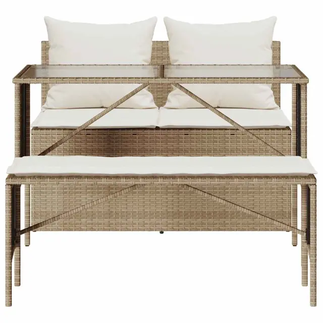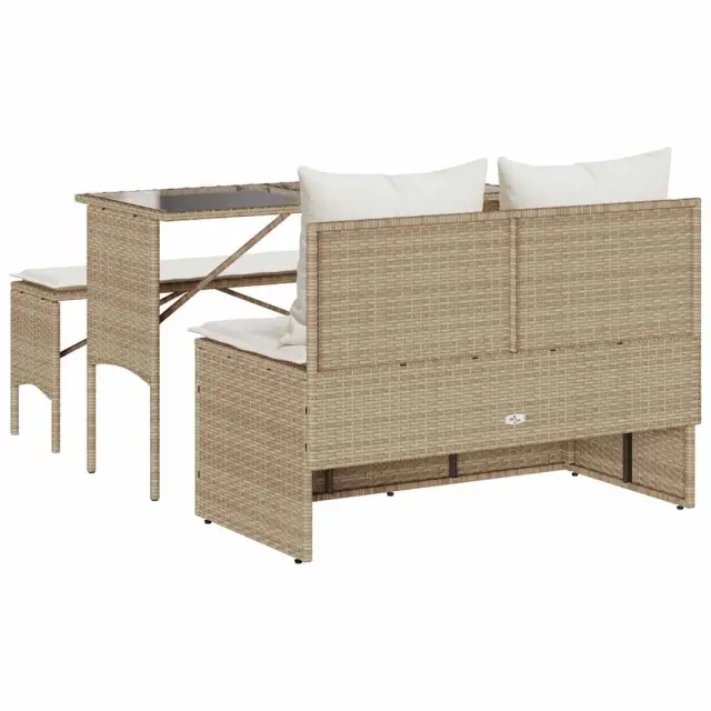 Ta vrtna jedilna garnitura je odlična izbira za večerjo na prostem ali za sprostitev na vrtu, dvorišču ali terasi. Trpežen material: PE ratan, znan tudi kot poli ratan, je močan sintetični material, ki ne potrebuje vzdrževanja in je videti kot naravni ratan. Je lahek, enostaven za čiščenje in se zaradi svoje vzdržljivosti in odpornosti na vremenske vplive pogosto uporablja za zunanje pohištvo.Steklena mizna plošča: Površina zunanje mize je izdelana iz močnega in trpežnega kaljenega stekla, kar omogoča enostavno čiščenje z vlažno krpo in vašemu zunanjemu prostoru doda pridih elegance.Udobno sedenje: To zunanje pohištvo z debelo oblazinjenimi blazinami zagotavlja udobno sedenje.Prevleko je mogoče odstraniti in oprati: Te sedežne blazine imajo odstranljive prevleke za lažje pranje in vzdrževanje.Robusten in stabilen okvir: Prašno barvan jekleni okvir zagotavlja, da je vrtno pohištvo močno in stabilno za vsakodnevno uporabo na prostem. Dobro je vedeti:Če želite, da vaše zunanje pohištvo ostane lepo, vam priporočamo, da ga zaščitite z vodoodporno prevleko.UV-odpornoMaks. nosilnost (na sedež): 110 kgPotrebno sestavljanje: DaMiza:Barva: BežMaterial: PE ratan, jeklo s prašnim premazom, kaljeno stekloDimenzije: 110 x 55 x 72,5 cm (d x š x v)Kavč brez naslonov za roke:Barva: BežMaterial: PE ratan, jeklen okvir s prašnim premazomDimenzije: 110 x 59 x 75 cm (Š x G x V)Velikost sedeža: 110 x 55 cm (Š x G)Višina sedeža od tal (brez blazine): 44 cmDolgi stolček:Barva: BežMaterial: PE ratan, jeklen okvir s prašnim premazomDimenzije: 105 x 30 x 42 cm (širina x globina x višina)Blazina:Barva: Kremno belaMaterial prevleke: Tkanina (100 % poliester)Polnilo sedežne blazine: PenaMaterial za polnjenje hrbtne blazine Material: vlakna PPDimenzije sedežne blazine (kavč): 100 x 55 x 3 cm (Š x G x T)Dimenzije sedežne blazine (stolček): 105 x 30 x 3 cm (Š x G x T)Dimenzije hrbtne blazine: (D x Š x T): 54 x 43 x 12 cm.Paket vsebuje:1 x Miza1 x Kavč brez naslonjal za roke1 x Dolg stolček2 x Sedežna blazina s snemljivo pralno prevleko2 x Blazina za hrbet 4104185