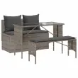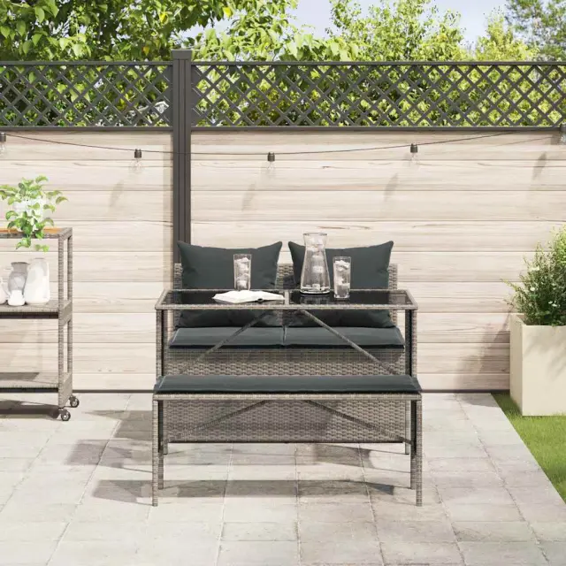 Ta vrtna jedilna garnitura je odlična izbira za večerjo na prostem ali za sprostitev na vrtu, dvorišču ali terasi. Trpežen material: PE ratan, znan tudi kot poli ratan, je močan sintetični material, ki ne potrebuje vzdrževanja in je videti kot naravni ratan. Je lahek, enostaven za čiščenje in se zaradi svoje vzdržljivosti in odpornosti na vremenske vplive pogosto uporablja za zunanje pohištvo.Steklena mizna plošča: Površina zunanje mize je izdelana iz močnega in trpežnega kaljenega stekla, kar omogoča enostavno čiščenje z vlažno krpo in vašemu zunanjemu prostoru doda pridih elegance.Udobno sedenje: To zunanje pohištvo z debelo oblazinjenimi blazinami zagotavlja udobno sedenje.Prevleko je mogoče odstraniti in oprati: Te sedežne blazine imajo odstranljive prevleke za lažje pranje in vzdrževanje.Robusten in stabilen okvir: Prašno barvan jekleni okvir zagotavlja, da je vrtno pohištvo močno in stabilno za vsakodnevno uporabo na prostem. Dobro je vedeti:Če želite, da vaše zunanje pohištvo ostane lepo, vam priporočamo, da ga zaščitite z vodoodporno prevleko.UV-odpornoMaks. nosilnost (na sedež): 110 kgPotrebno sestavljanje: DaMiza:Barva: SivaMaterial: PE ratan, jeklo s prašnim premazom, kaljeno stekloDimenzije: 110 x 55 x 72,5 cm (d x š x v)Kavč brez naslonov za roke:Barva: SivaMaterial: PE ratan, jeklen okvir s prašnim premazomDimenzije: 110 x 59 x 75 cm (Š x G x V)Velikost sedeža: 110 x 55 cm (Š x G)Višina sedeža od tal (brez blazine): 44 cmDolgi stolček:Barva: SivaMaterial: PE ratan, jeklen okvir s prašnim premazomDimenzije: 105 x 30 x 42 cm (širina x globina x višina)Blazina:Barva: Temno sivaMaterial prevleke: Tkanina (100 % poliester)Polnilo sedežne blazine: PenaMaterial za polnjenje hrbtne blazine Material: vlakna PPDimenzije sedežne blazine (kavč): 100 x 55 x 3 cm (Š x G x T)Dimenzije sedežne blazine (stolček): 105 x 30 x 3 cm (Š x G x T)Dimenzije hrbtne blazine: (D x Š x T): 54 x 43 x 12 cm.Paket vsebuje:1 x Miza1 x Kavč brez naslonjal za roke1 x Dolg stolček2 x Sedežna blazina s snemljivo pralno prevleko2 x Blazina za hrbet 4104183