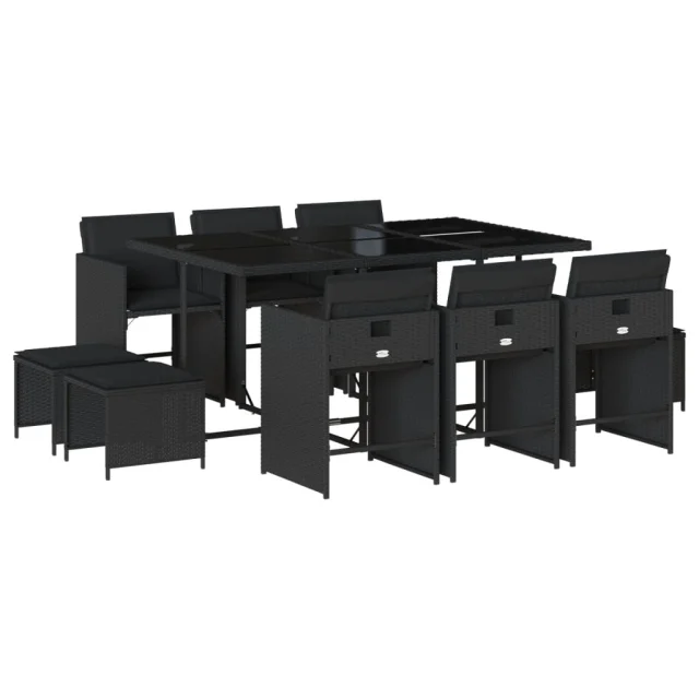 vidaXL Vrtna jedilna garnitura 11-delna z blazinami črna poli ratan