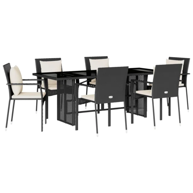 vidaXL Vrtna jedilna garnitura 7-delna z blazinami črna poli ratan
