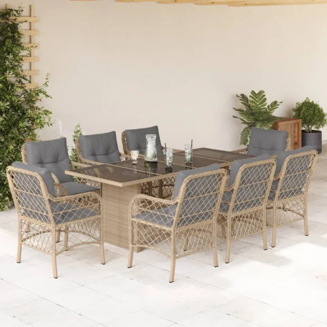 vidaXL Vrtna jedilna garnitura 9-delna z blazinami bež poli ratan