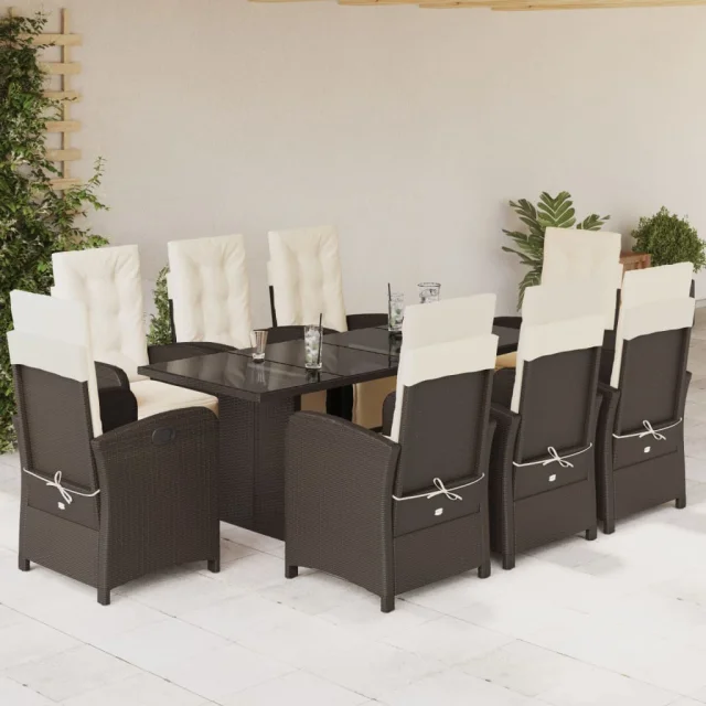 vidaXL Vrtna jedilna garnitura 9-delna z blazinami rjav poli ratan