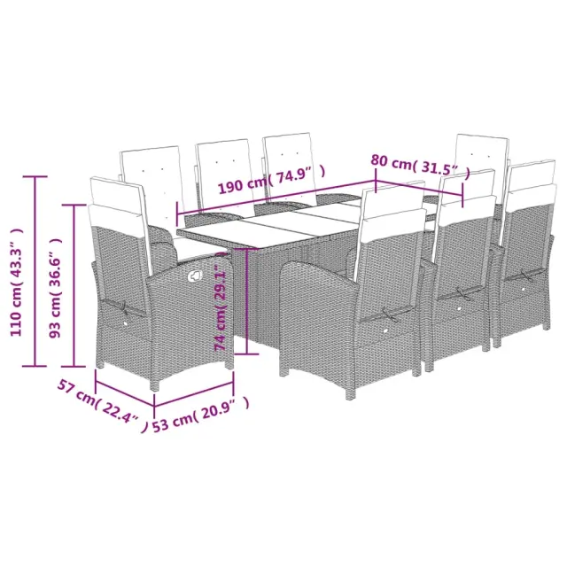 vidaXL Vrtna jedilna garnitura 9-delna z blazinami sv. siv poli ratan