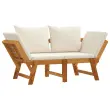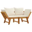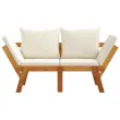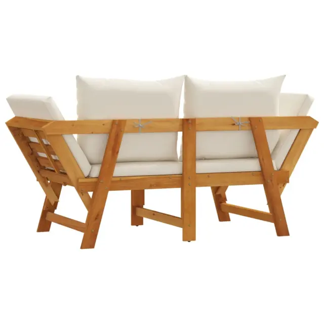 Ta zunanja vrtna klop 2 v 1 je popolna izbira za sprostitev na vaši verandi na sončen dan ali za poležavanje in opazovanje zvezd ponoči. Robustno in stabilno: Trden akacijev les je znan po svoji trdnosti in trajnosti. Različne barve in edinstveni vzorci zrn mu dajejo privlačen videz. Zaradi dobre stabilnosti in odpornosti na vremenske vplive je idealen za izdelavo notranjega in zunanjega pohištva.Zasnova 2 v 1: Zahvaljujoč nastavljivim stranicam je mogoče vrtni sedež hitro in enostavno spremeniti iz klopi v dnevno posteljo in nazaj.Udobno sedenje: To zunanje pohištvo z debelo oblazinjenimi blazinami zagotavlja udobno sedenje.Dobro prezračevanje in brez nabiranja vode: Letvice spodbujajo optimalen pretok zraka in učinkovito preprečujejo nabiranje vode. S tem je zagotovljeno suho in udobno sedenje. Dobro je vedeti:Če želite, da vaše zunanje pohištvo ostane lepo, vam priporočamo, da ga zaščitite z vodoodporno prevleko.Klop 2 v 1:Material: Trden akacijev les z oljnim premazomCelotne dimenzije: (160-205) x 74 x 66 cm (Š x G x V)Velikost (postavljena): 200 x 70 cm (Š x G)Višina sedeža, od tal (brez blazine): 36 cmVišina naslonjala za roke, merjena od tal: 66 cmMaksimalna nosilnost (na sedež): 110 kgLežalnik 2 v 1Obe stranici sta nastavljiviBlazina:Barva: Kremno belaMaterial prevleke: Tkanina (100 % poliester)Material polnila: PenaDimenzije sedežne blazine: 200 x 70 x 7 cm (D × Š × D)Dimenzije blazine za hrbet: 62 x 50 x 18 cm (D x Š x D)Paket vsebuje:1 x Vrtna klop1 x Blazina za sedež2 x Blazina za hrbet 367579