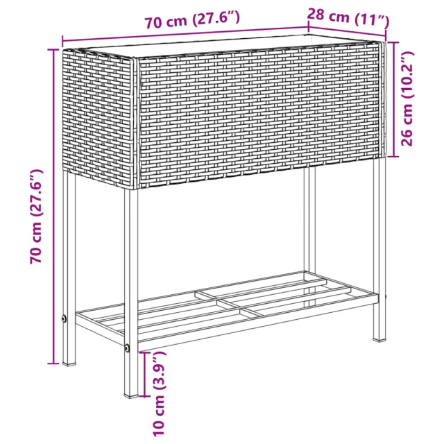 • Praktična polica: V vrtno cvetlično korito je vgrajena polica, na kateri lahko na dosegu roke shranite zemljo za lončnice in pripomočke za sajenje rastlin. Poleg tega polica preprečuje, da bi se voda, trava in umazanija s tal dotaknili dvignjenega korita za zelenjavo, tako da ostane čisto in lepo.