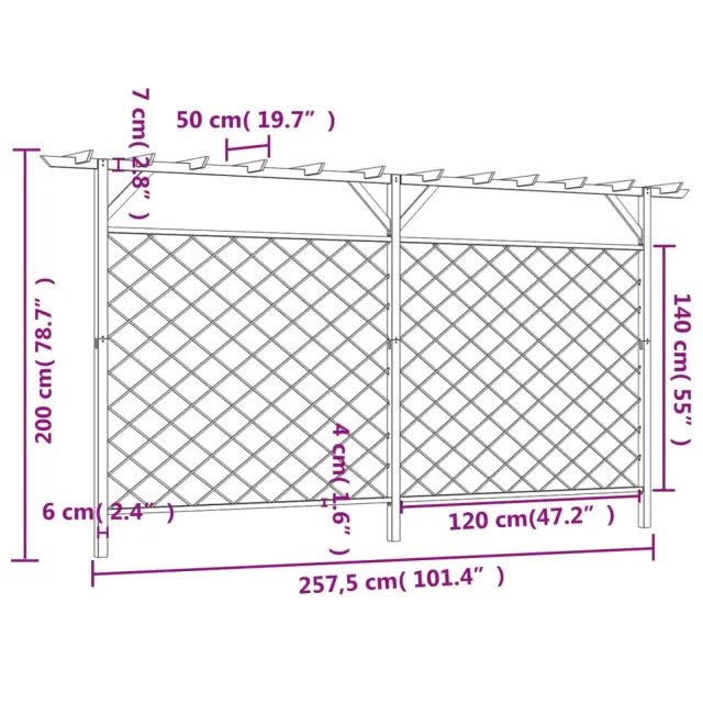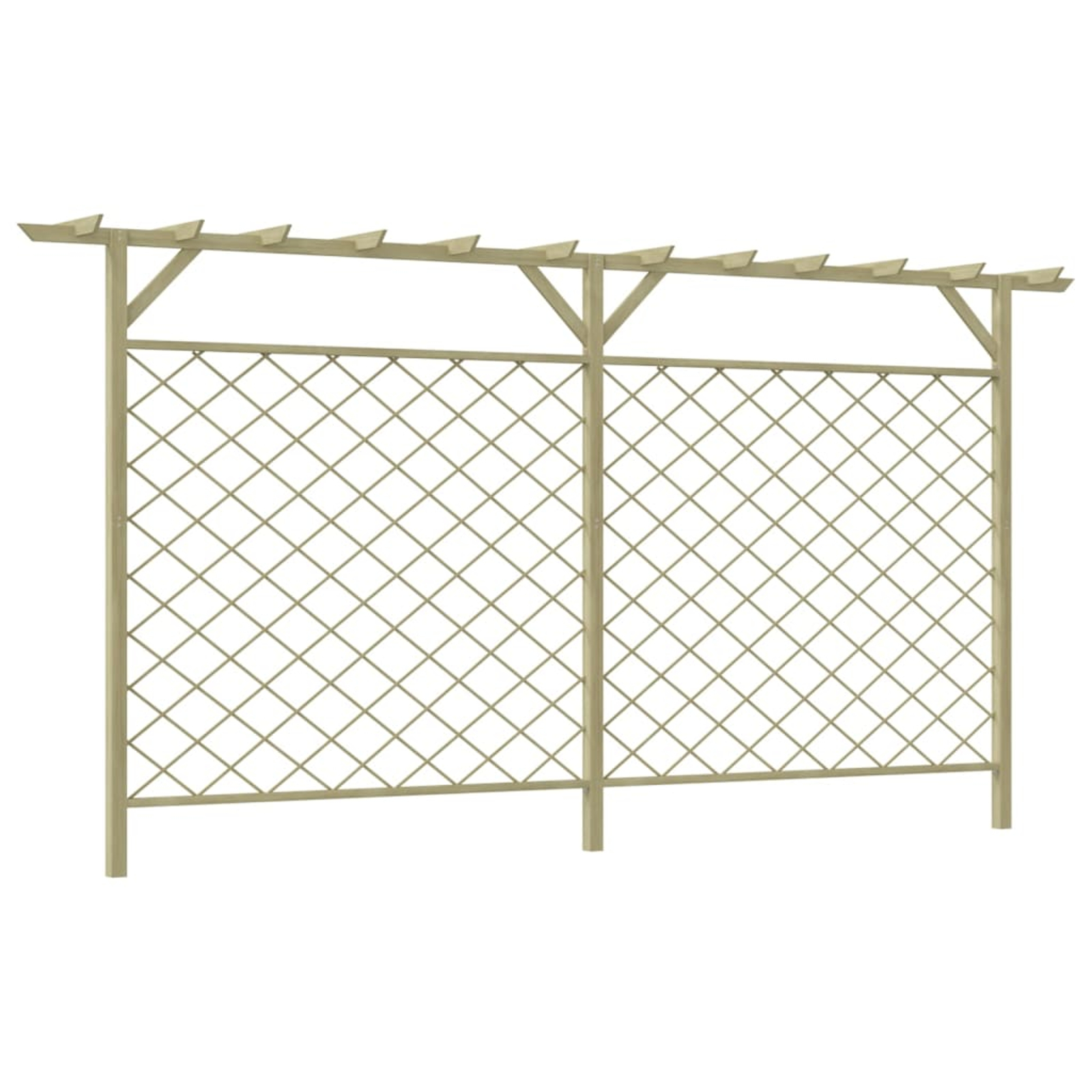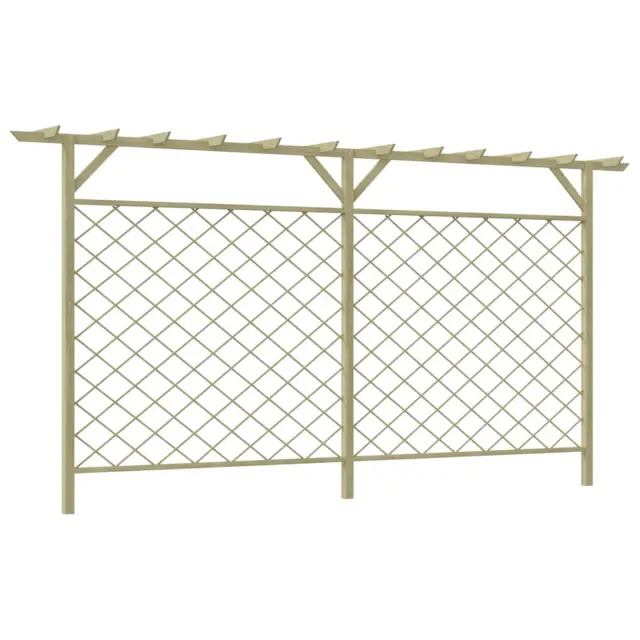 Izdelana je iz zelene impregnirane borovine, zato je ograja zelo močna, vzdržljiva in odporna na trohnenje. Nudila vam bo visoko stopnjo zasebnosti in varnosti. Zahvaljujoč vgrajenim mrežastim panelom in zgornji pergoli ograja nudi obilo prostora za rast vzpenjavk in drugih rastlin, kar bo prispevalo k zasebnosti in prijetnemu izgledu ograje.