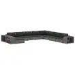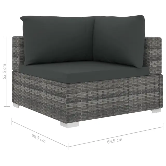 Ta garnitura je sestavljena iz 11 kosov, zato jo boste lahko postavili po želji in ustvarili kombinacije, ki so vam všeč. Izdelana je iz trpežnega ročno tkanega PE ratana, pod katerim je prašno premazan jeklen okvir, ta garnitura je močna, trpežna in odporna na vremenske vplive. Zahvaljujoč vremensko odpornemu PE ratanu je počivalna garnitura enostavna za čiščenje, trpežna in primerna za vsakodnevno uporabo. Debelo podložene blazine in izjemno globoka moderna sedišča zagotavljajo, da se boste vedno veselili sprostitve na tej garnituri. Prevleke za sedežne blazine imajo zadrge, zato jih boste zlahka oprali. Komplet vsebuje 2 stranski mizici v dveh velikostih, ki nudijo dovolj prostora za odlaganje pijače, košar s sadjem, knjig, revij itd. Vse to imate lahko pri roki. Zaradi lahkega in modularnega dizajna lahko ta komplet tudi enostavno premikate po vaši hiši.