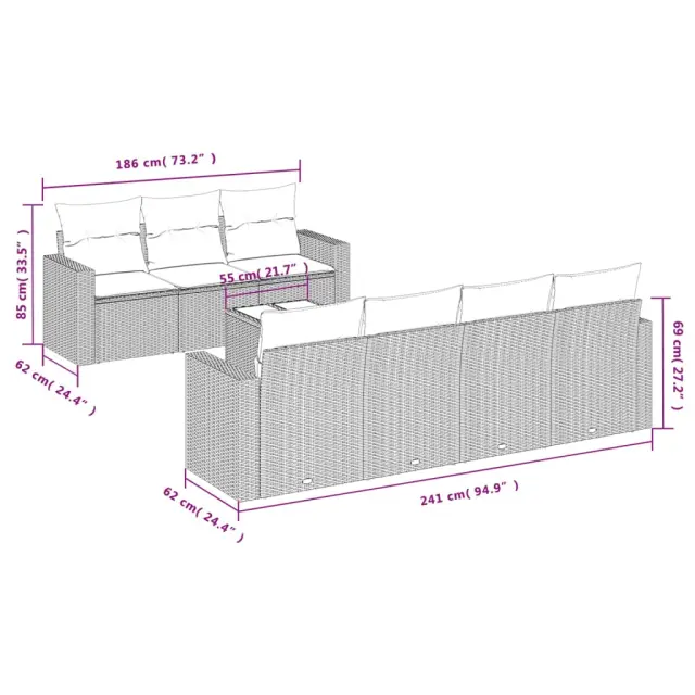 vidaXL Vrtna sedežna garnitura 8-delna z blazinami siv poli ratan