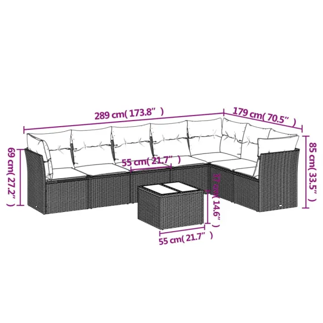 • Celotne dimenzije kavča s 7 sedeži: 289 x 179 x 69 cm (Š x G x V)