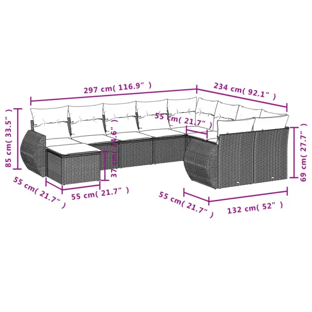 vidaXL Vrtna sedežna garnitura 10-delna z blazinami siv poli ratan