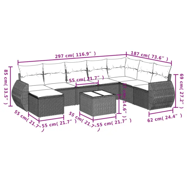 vidaXL Vrtna sedežna garnitura 9-delna z blazinami črn poli ratan