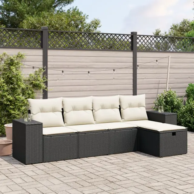 Ta vrtna sedežna garnitura je popoln dodatek za vaše dvorišče, teraso ali verando, saj zagotavlja udoben in vabljiv prostor za klepet z družino in prijatelji ali preprosto za sprostitev in uživanje na prostem. Vzdržljiv material: PE ratan, znan tudi kot poli ratan, je močan sintetični material, ki zahteva malo vzdrževanja in je videti kot naravni ratan. Je lahek, enostaven za čiščenje in se zaradi svoje vzdržljivosti in odpornosti na vremenske vplive pogosto uporablja za zunanje pohištvo.Udobno sedenje: To zunanje pohištvo z debelo oblazinjenimi blazinami zagotavlja udobno sedenje.Prevleko je mogoče odstraniti in oprati: Te sedežne blazine imajo odstranljive prevleke za lažje pranje in vzdrževanje.Robusten in stabilen okvir: Prašno barvan jekleni okvir zagotavlja, da je vrtno pohištvo močno in stabilno za vsakodnevno uporabo na prostem.Modularna zasnova: Ta komplet zunanjega pohištva ima modularno zasnovo, zaradi česar je popolnoma prilagodljiv in enostaven za premikanje, tako da lahko zunanjo garnituro postavite kakor koli želite. Dobro je vedeti:Če želite, da vaše zunanje pohištvo ostane lepo, vam priporočamo, da ga zaščitite z vodoodporno prevleko.Maksimalna nosilnost (na sedež): 110 kgUV-odpornoPotrebno sestavljanje: DaSrednji sedež:Barva: ČrnaMaterial: PE ratan, jeklen okvir s prašnim premazomDimenzije: 55 x 62 x 69 cm (Š x G x V)Velikost sedeža: 55 x 55 cm (Š x G)Višina sedeža, merjena od tal: 37 cmKavč z naslonjali za roke:Barva: ČrnaMaterial: PE ratan, jeklen okvir s prašnim premazomDimenzije: 83 x 62 x 69 cm (Š x G x V)Velikost sedeža: 55 x 55 cm (Š x G)Višina sedeža, merjena od tal: 37 cmVišina naslonjal za roke od tal: 55 cmStolček za noge:Barva: ČrnaMaterial: PE ratan, jeklen okvir s prašnim premazomDimenzije: 55 x 55 x 37 cm (Š x G x V)Velikost sedeža: 55 x 55 cm (Š x G)Višina sedeža, merjena od tal: 37 cmBlazina:Barva: Kremno belaMaterial prevleke: Tkanina (100 % poliester)Polnilo sedežne blazine: PenaPolnilo hrbtne blazine: bombažna vlaknaDimenzije sedežne blazine: 55 x 55 x 3 cm (Š x G x D)Dimenzije hrbtne blazine: 55 x 45 x 13 cm (D x Š x D)Paket vsebuje:2 x Sredinski sedež2 x Kavč z naslonjali za roke1 x Stolček za noge5 x Blazina za hrbet5 x Sedežna blazina s snemljivo pralno prevleko 3264392