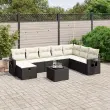 Ta vrtna sedežna garnitura je popoln dodatek za vaše dvorišče, teraso ali verando, saj zagotavlja udoben in vabljiv prostor za klepet z družino in prijatelji ali preprosto za sprostitev in uživanje na prostem. Vzdržljiv material: PE ratan, znan tudi kot poli ratan, je močan sintetični material, ki zahteva malo vzdrževanja in je videti kot naravni ratan. Je lahek, enostaven za čiščenje in se zaradi svoje vzdržljivosti in odpornosti na vremenske vplive pogosto uporablja za zunanje pohištvo.Steklena mizna plošča: Površina zunanje mize je izdelana iz močnega in trpežnega kaljenega stekla, kar omogoča enostavno čiščenje z vlažno krpo in vašemu zunanjemu prostoru doda pridih elegance.Prevleko je mogoče odstraniti in oprati: Te sedežne blazine imajo odstranljive prevleke za lažje pranje in vzdrževanje.Robusten in stabilen okvir: Prašno barvan jekleni okvir zagotavlja, da je vrtno pohištvo močno in stabilno za vsakodnevno uporabo na prostem.Modularna zasnova: Ta komplet zunanjega pohištva ima modularno zasnovo, zaradi česar je popolnoma prilagodljiv in enostaven za premikanje, tako da lahko zunanjo garnituro postavite kakor koli želite. Dobro je vedeti:Če želite, da vaše zunanje pohištvo ostane lepo, vam priporočamo, da ga zaščitite z vodoodporno prevleko.Maksimalna nosilnost (na sedež): 110 kgUV-odpornoPotrebno sestavljanje: DaKotni sedež:Barva: ČrnaMaterial: PE ratan, jeklen okvir s prašnim premazomDimenzije: 62 x 62 x 69 cm (Š x G x V)Velikost sedeža: 55 x 55 cm (Š x G)Višina sedeža, merjena od tal: 37 cmSrednji sedež:Barva: ČrnaMaterial: PE ratan, jeklen okvir s prašnim premazomDimenzije: 55 x 62 x 69 cm (Š x G x V)Velikost sedeža: 55 x 55 cm (Š x G)Višina sedeža, merjena od tal: 37 cmKavč z naslonjali za roke:Barva: ČrnaMaterial: PE ratan, jeklen okvir s prašnim premazomDimenzije: 61,5 x 62 x 69 cm (Š x G x V)Velikost sedeža: 55 x 55 cm (Š x G)Višina sedeža, merjena od tal: 37 cmVišina naslonjal za roke od tal: 55 cmStolček za noge:Barva: ČrnaMaterial: PE ratan, jeklen okvir s prašnim premazomDimenzije: 55 x 55 x 37 cm (Š x G x V)Velikost sedeža: 55 x 55 cm (Š x G)Višina sedeža, merjena od tal: 37 cmMiza:Barva: ČrnaMaterial: PE ratan, jeklo s prašnim premazom, kaljeno stekloDimenzije: 55 x 55 x 37 cm (D x Š x V)Blazina:Barva: Kremno belaMaterial prevleke: Tkanina (100 % poliester)Polnilo sedežne blazine: PenaPolnilo hrbtne blazine: bombažna vlaknaDimenzije sedežne blazine: 55 x 55 x 3 cm (Š x G x D)Dimenzije hrbtne blazine: 55 x 45 x 13 cm (D x Š x D)Paket vsebuje:1 x Kotni sedež4 x Srednji sedež2 x Kavč z naslonjali za roke1 x Stolček za noge1 x Vrtna miza9 x Blazina za hrbet8 x Sedežna blazina s snemljivo in pralno prevleko 3263902
