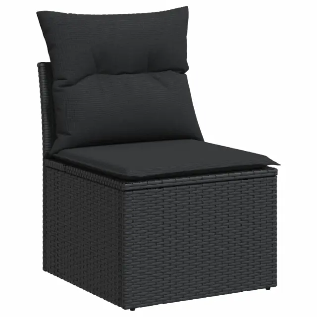 Ta vrtna sedežna garnitura je popoln dodatek za vaše dvorišče, teraso ali verando, saj zagotavlja udoben in vabljiv prostor za klepet z družino in prijatelji ali preprosto za sprostitev in uživanje na prostem. Vzdržljiv material: PE ratan, znan tudi kot poli ratan, je močan sintetični material, ki zahteva malo vzdrževanja in je videti kot naravni ratan. Je lahek, enostaven za čiščenje in se zaradi svoje vzdržljivosti in odpornosti na vremenske vplive pogosto uporablja za zunanje pohištvo.Priročna stranska mizica: To zunanje pohištvo ima zložljivo stransko mizico s pnevmatsko vzmetjo na naslonjalih za roke, ki zagotavlja priročen prostor za shranjevanje potrebščin na dosegu roke.Prevleko je mogoče odstraniti in oprati: Te sedežne blazine imajo odstranljive prevleke za lažje pranje in vzdrževanje.Modularna zasnova: Ta komplet zunanjega pohištva ima modularno zasnovo, zaradi česar je popolnoma prilagodljiv in enostaven za premikanje, tako da lahko zunanjo garnituro postavite kakor koli želite. Dobro je vedeti:Če želite, da vaše zunanje pohištvo ostane lepo, vam priporočamo, da ga zaščitite z vodoodporno prevleko.Maksimalna nosilnost (na sedež): 110 kgUV-odpornoPlastične nastavljive nogePotrebno sestavljanje: DaKotni sedež:Barva: ČrnaMaterial: PE ratan, jeklen okvir s prašnim premazomDimenzije: 62 x 62 x 69 cm (Š x G x V)Velikost sedeža: 55 x 55 cm (Š x G)Višina sedeža, merjena od tal: 37 cmSrednji sedež:Barva: ČrnaMaterial: PE ratan, jeklen okvir s prašnim premazomDimenzije: 55 x 62 x 69 cm (Š x G x V)Velikost sedeža: 55 x 55 cm (Š x G)Višina sedeža, merjena od tal: 37 cmKavč z naslonjali za roke:Barva: ČrnaMaterial: PE ratan, prašno premazano jeklo, trden akacijev les z oljnim premazomDimenzije: 62/85 x 62 x 69 cm (Š x G x V)Velikost sedeža: 55 x 55 cm (Š x G)Višina sedeža, merjena od tal: 37 cmVišina naslonjal za roke od tal: 55 cmŠirina naslonjala za roke: 6 cmVelikost stranske mizice: 24,5 x 23,5 cm (D × Š)Blazina:Barva: ČrnaMaterial prevleke: Tkanina (100 % poliester)Polnilo sedežne blazine: PenaPolnilo hrbtne blazine: bombažna vlaknaDimenzije sedežne blazine: 55 x 55 x 3 cm (Š x G x D)Dimenzije hrbtne blazine: 55 x 45 x 13 cm (D x Š x D)Paket vsebuje:1 x Kotni sedež2 x Sredinski sedež2 x Kavč z naslonjali za roke6 x Blazina za hrbet5 x Sedežna blazina s snemljivo pralno prevleko 3226783