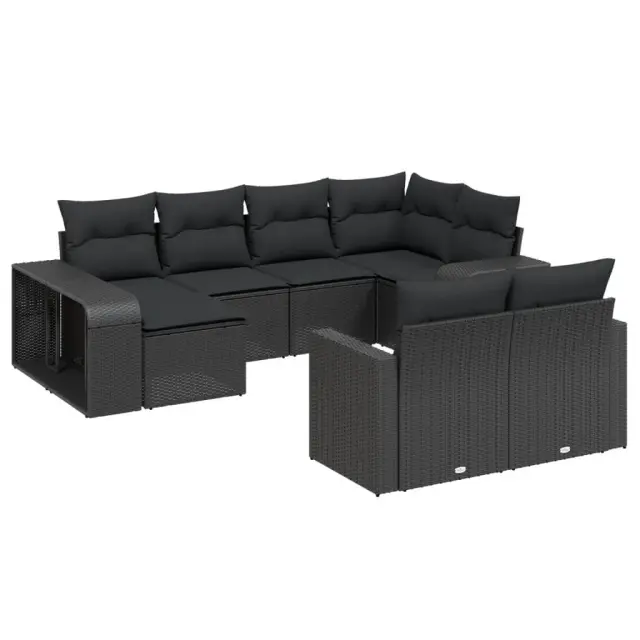 Ta vrtna sedežna garnitura je popoln dodatek za vaše dvorišče, teraso ali verando, saj zagotavlja udoben in vabljiv prostor za klepet z družino in prijatelji ali preprosto za sprostitev in uživanje na prostem. Vzdržljiv material: PE ratan, znan tudi kot poli ratan, je močan sintetični material, ki zahteva malo vzdrževanja in je videti kot naravni ratan. Je lahek, enostaven za čiščenje in se zaradi svoje vzdržljivosti in odpornosti na vremenske vplive pogosto uporablja za zunanje pohištvo.Udobno sedenje: Ta zunanji kavč z debelo oblazinjenimi blazinami zagotavlja udobno sedenje.Prevleko je mogoče odstraniti in oprati: Te sedežne blazine imajo odstranljive prevleke za lažje pranje in vzdrževanje.Modularna zasnova: Ta komplet zunanjega pohištva ima modularno zasnovo, zaradi česar je popolnoma prilagodljiv in enostaven za premikanje, tako da lahko zunanjo garnituro postavite kakor koli želite. Dobro je vedeti:Če želite, da vaše zunanje pohištvo ostane lepo, vam priporočamo, da ga zaščitite z vodoodporno prevleko.Maksimalna nosilnost (na sedež): 110 kgUV-odpornoPlastične nastavljive nogePotrebno sestavljanje: DaKavč z naslonjali za roke:Barva: ČrnaMaterial: PE ratan, jeklen okvir s prašnim premazomDimenzije: 65,5 x 62 x 69 cm (Š x G x V)Velikost sedeža: 55 x 55 cm (Š x G)Višina sedeža, merjena od tal: 37 cmVišina naslonjal za roke od tal: 55 cmŠirina naslonjala za roke: 10 cmKotni sedež:Barva: ČrnaMaterial: PE ratan, jeklen okvir s prašnim premazomDimenzije: 62 x 62 x 69 cm (Š x G x V)Velikost sedeža: 55 x 55 cm (Š x G)Višina sedeža, merjena od tal: 37 cmSrednji sedež:Barva: ČrnaMaterial: PE ratan, jeklen okvir s prašnim premazomDimenzije: 55 x 62 x 69 cm (Š x G x V)Velikost sedeža: 55 x 55 cm (Š x G)Višina sedeža, merjena od tal: 37 cmStolček:Barva: ČrnaMaterial: PE ratan, jeklen okvir s prašnim premazomDimenzije: 55 x 55 x 37 cm (Š x G x V)Polica za shranjevanje:Barva: ČrnaMaterial: PE ratan, jeklen okvir s prašnim premazomDimenzije (L): 112 x 27 x 55 cm (D x Š x V)Dimenzije (S): 58 x 27 x 55 cm (D x Š x V)Blazina:Barva: ČrnaMaterial prevleke: Tkanina (100 % poliester)Polnilo sedežne blazine: PenaPolnilo hrbtne blazine: bombažna vlaknaDimenzije sedežne blazine: 55 x 55 x 3 cm (Š x G x D)Dimenzije hrbtne blazine: 55 x 45 x 13 cm (D x Š x D)Paket vsebuje:2 x Kavč z naslonjali za roke1 x Kotni sedež4 x Srednji sedež1 x Vrtni stolček2 x Regal s policami8 x Blazina za hrbet8 x Sedežna blazina s snemljivo in pralno prevleko 3228895