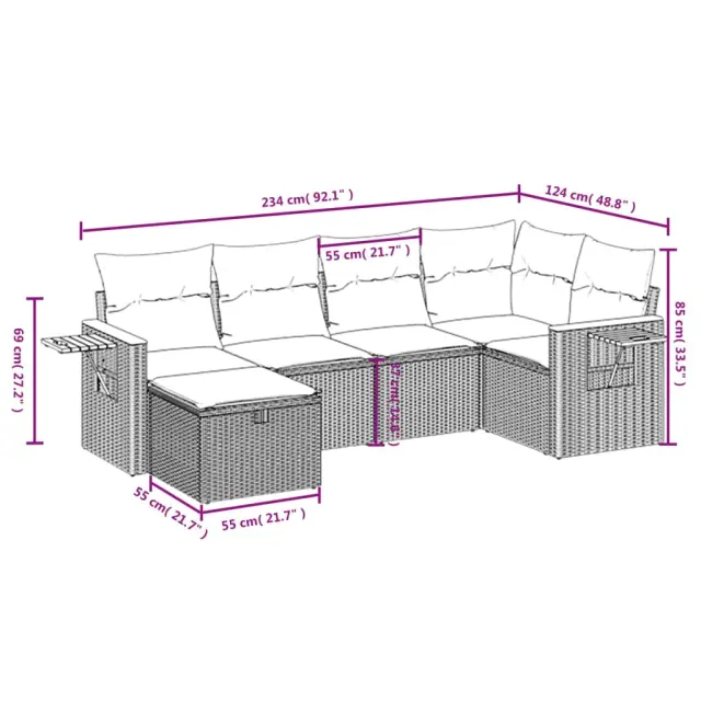 Ta vrtna sedežna garnitura je popoln dodatek za vaše dvorišče, teraso ali verando, saj zagotavlja udoben in vabljiv prostor za klepet z družino in prijatelji ali preprosto za sprostitev in uživanje na prostem. Vzdržljiv material: PE ratan, znan tudi kot poli ratan, je močan sintetični material, ki zahteva malo vzdrževanja in je videti kot naravni ratan. Je lahek, enostaven za čiščenje in se zaradi svoje vzdržljivosti in odpornosti na vremenske vplive pogosto uporablja za zunanje pohištvo.Udobno sedenje: To zunanje pohištvo z debelo oblazinjenimi blazinami zagotavlja udobno sedenje.Prevleko je mogoče odstraniti in oprati: Te sedežne blazine imajo odstranljive prevleke za lažje pranje in vzdrževanje.Robusten in stabilen okvir: Prašno barvan jekleni okvir zagotavlja, da je vrtno pohištvo močno in stabilno za vsakodnevno uporabo na prostem.Modularna zasnova: Ta komplet zunanjega pohištva ima modularno zasnovo, zaradi česar je popolnoma prilagodljiv in enostaven za premikanje, tako da lahko zunanjo garnituro postavite kakor koli želite. Dobro je vedeti:Če želite, da vaše zunanje pohištvo ostane lepo, vam priporočamo, da ga zaščitite z vodoodporno prevleko.Maksimalna nosilnost (na sedež): 110 kgUV-odpornoPotrebno sestavljanje: DaKotni sedež:Barva: Mešano bežMaterial: PE ratan, jeklen okvir s prašnim premazomDimenzije: 62 x 62 x 69 cm (Š x G x V)Velikost sedeža: 55 x 55 cm (Š x G)Višina sedeža, merjena od tal: 37 cmSrednji sedež:Barva: Mešano bežMaterial: PE ratan, jeklen okvir s prašnim premazomDimenzije: 55 x 62 x 69 cm (Š x G x V)Velikost sedeža: 55 x 55 cm (Š x G)Višina sedeža, merjena od tal: 37 cmKavč z naslonjali za roke:Barva: Mešano bežMaterial: PE ratan, jeklen okvir s prašnim premazomDimenzije: 61,5 x 62 x 69 cm (Š x G x V)Velikost sedeža: 55 x 55 cm (Š x G)Višina sedeža, merjena od tal: 37 cmVišina naslonjal za roke od tal: 55 cmStolček za noge:Barva: Mešano bežMaterial: PE ratan, jeklen okvir s prašnim premazomDimenzije: 55 x 55 x 37 cm (Š x G x V)Velikost sedeža: 55 x 55 cm (Š x G)Višina sedeža, merjena od tal: 37 cmBlazina:Barva: Svetlo sivaMaterial prevleke: Tkanina (100 % poliester)Polnilo sedežne blazine: PenaPolnilo hrbtne blazine: bombažna vlaknaDimenzije sedežne blazine: 55 x 55 x 3 cm (Š x G x D)Dimenzije hrbtne blazine: 55 x 45 x 13 cm (D x Š x D)Paket vsebuje:1 x Kotni sedež2 x Sredinski sedež2 x Kavč z naslonjali za roke1 x Stolček za noge7 x Hrbtna blazina6 x Sedežna blazina s snemljivo pralno prevleko 3265518