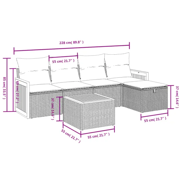 Ta vrtna sedežna garnitura je popoln dodatek za vaše dvorišče, teraso ali verando, saj zagotavlja udoben in vabljiv prostor za klepet z družino in prijatelji ali preprosto za sprostitev in uživanje na prostem. Vzdržljiv material: PE ratan, znan tudi kot poli ratan, je močan sintetični material, ki zahteva malo vzdrževanja in je videti kot naravni ratan. Je lahek, enostaven za čiščenje in se zaradi svoje vzdržljivosti in odpornosti na vremenske vplive pogosto uporablja za zunanje pohištvo.Stabilna mizna plošča, ki je enostavna za čiščenje: Ta vrtna miza ima ploščo iz akacijevega lesa, ki je čvrsta, vzdržljiva in jo je enostavno čistiti z vlažno krpo.Prevleko je mogoče odstraniti in oprati: Te sedežne blazine imajo odstranljive prevleke za lažje pranje in vzdrževanje.Robusten in stabilen okvir: Prašno barvan jekleni okvir zagotavlja, da je vrtno pohištvo močno in stabilno za vsakodnevno uporabo na prostem.Modularna zasnova: Ta komplet zunanjega pohištva ima modularno zasnovo, zaradi česar je popolnoma prilagodljiv in enostaven za premikanje, tako da lahko zunanjo garnituro postavite kakor koli želite. Dobro je vedeti:Če želite, da vaše zunanje pohištvo ostane lepo, vam priporočamo, da ga zaščitite z vodoodporno prevleko.Maksimalna nosilnost (na sedež): 110 kgUV-odpornoPotrebno sestavljanje: DaSrednji sedež:Barva: ČrnaMaterial: PE ratan, jeklen okvir s prašnim premazomDimenzije: 55 x 62 x 69 cm (Š x G x V)Velikost sedeža: 55 x 55 cm (Š x G)Višina sedeža, merjena od tal: 37 cmKavč z naslonjali za roke:Barva: ČrnaMaterial: PE ratan, jeklen okvir s prašnim premazomDimenzije: 59 x 62 x 69 cm (Š x G x V)Velikost sedeža: 55 x 55 cm (Š x G)Višina sedeža, merjena od tal: 37 cmVišina naslonjal za roke od tal: 55 cmStolček za noge:Barva: ČrnaMaterial: PE ratan, jeklen okvir s prašnim premazomDimenzije: 55 x 55 x 37 cm (Š x G x V)Velikost sedeža: 55 x 55 cm (Š x G)Višina sedeža, merjena od tal: 37 cmMiza:Barva: ČrnaMaterial: PE ratan, prašno premazano jeklo, trden akacijev les z oljnim premazomDimenzije: 55 x 55 x 37 cm (D x Š x V)Blazina:Barva: Kremno belaMaterial prevleke: Tkanina (100 % poliester)Polnilo sedežne blazine: PenaPolnilo hrbtne blazine: bombažna vlaknaDimenzije sedežne blazine: 55 x 55 x 3 cm (Š x G x D)Dimenzije hrbtne blazine: 55 x 45 x 13 cm (D x Š x D)Paket vsebuje:2 x Sredinski sedež2 x Kavč z naslonjali za roke1 x Stolček za noge1 x Vrtna miza5 x Blazina za hrbet5 x Sedežna blazina s snemljivo pralno prevleko 3265725