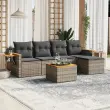 Ta vrtna sedežna garnitura je popoln dodatek za vaše dvorišče, teraso ali verando, saj zagotavlja udoben in vabljiv prostor za klepet z družino in prijatelji ali preprosto za sprostitev in uživanje na prostem. Vzdržljiv material: PE ratan, znan tudi kot poli ratan, je močan sintetični material, ki zahteva malo vzdrževanja in je videti kot naravni ratan. Je lahek, enostaven za čiščenje in se zaradi svoje vzdržljivosti in odpornosti na vremenske vplive pogosto uporablja za zunanje pohištvo.Stabilna mizna plošča, ki je enostavna za čiščenje: Ta vrtna miza ima ploščo iz akacijevega lesa, ki je čvrsta, vzdržljiva in jo je enostavno čistiti z vlažno krpo.Priročna stranska mizica: To zunanje pohištvo ima zložljivo stransko mizico s pnevmatsko vzmetjo na naslonjalih za roke, ki zagotavlja priročen prostor za shranjevanje potrebščin na dosegu roke.Prevleko je mogoče odstraniti in oprati: Te sedežne blazine imajo odstranljive prevleke za lažje pranje in vzdrževanje.Modularna zasnova: Ta komplet zunanjega pohištva ima modularno zasnovo, zaradi česar je popolnoma prilagodljiv in enostaven za premikanje, tako da lahko zunanjo garnituro postavite kakor koli želite. Dobro je vedeti:Če želite, da vaše zunanje pohištvo ostane lepo, vam priporočamo, da ga zaščitite z vodoodporno prevleko.Maksimalna nosilnost (na sedež): 110 kgUV-odpornoPlastične nastavljive nogePotrebno sestavljanje: DaStolček za noge:Barva: SivaMaterial: PE ratan, jeklen okvir s prašnim premazomDimenzije: 55 x 55 x 37 cm (Š x G x V)Srednji sedež:Barva: SivaMaterial: PE ratan, jeklen okvir s prašnim premazomDimenzije: 55 x 62 x 69 cm (Š x G x V)Velikost sedeža: 55 x 55 cm (Š x G)Višina sedeža, merjena od tal: 37 cmKavč z naslonjali za roke:Barva: SivaMaterial: PE ratan, prašno premazano jeklo, trden akacijev les z oljnim premazomDimenzije: 62/85 x 62 x 69 cm (Š x G x V)Velikost sedeža: 55 x 55 cm (Š x G)Višina sedeža, merjena od tal: 37 cmVišina naslonjal za roke od tal: 55 cmŠirina naslonjala za roke: 6 cmVelikost stranske mizice: 24,5 x 23,5 cm (D × Š)Miza:Barva: SivaMaterial: PE ratan, prašno premazano jeklo, trden akacijev les z oljnim premazomDimenzije: 55 x 55 x 37 cm (D x Š x V)Blazina:Barva: Temno sivaMaterial prevleke: Tkanina (100 % poliester)Polnilo sedežne blazine: PenaPolnilo hrbtne blazine: bombažna vlaknaDimenzije sedežne blazine: 55 x 55 x 3 cm (Š x G x D)Dimenzije hrbtne blazine: 55 x 45 x 13 cm (D x Š x D)Paket vsebuje:1 x Stolček za noge2 x Sredinski sedež2 x Kavč z naslonjali za roke1 x Miza4 x Blazina za hrbet5 x Sedežna blazina s snemljivo pralno prevleko 3226767