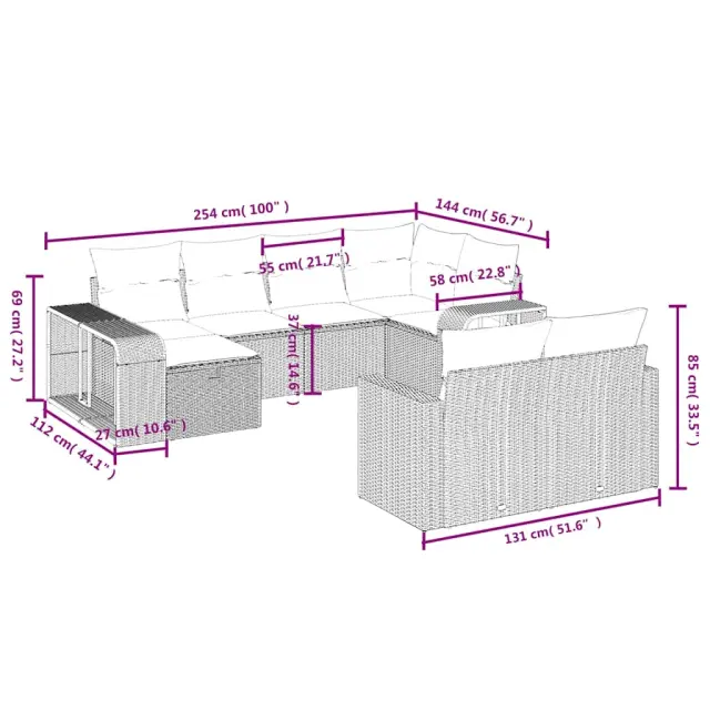 Ta vrtna sedežna garnitura je popoln dodatek za vaše dvorišče, teraso ali verando, saj zagotavlja udoben in vabljiv prostor za klepet z družino in prijatelji ali preprosto za sprostitev in uživanje na prostem. Vzdržljiv material: PE ratan, znan tudi kot poli ratan, je močan sintetični material, ki zahteva malo vzdrževanja in je videti kot naravni ratan. Je lahek, enostaven za čiščenje in se zaradi svoje vzdržljivosti in odpornosti na vremenske vplive pogosto uporablja za zunanje pohištvo.Veliko prostora za shranjevanje: To zunanje pohištvo z vgrajenim prostorom za shranjevanje ponuja veliko prostora za shranjevanje, da bodo vaše potrebščine urejene in lahko dostopne.Prevleko je mogoče odstraniti in oprati: Te sedežne blazine imajo odstranljive prevleke za lažje pranje in vzdrževanje.Modularna zasnova: Ta komplet zunanjega pohištva ima modularno zasnovo, zaradi česar je popolnoma prilagodljiv in enostaven za premikanje, tako da lahko zunanjo garnituro postavite kakor koli želite. Dobro je vedeti:Če želite, da vaše zunanje pohištvo ostane lepo, vam priporočamo, da ga zaščitite z vodoodporno prevleko.Maksimalna nosilnost (na sedež): 110 kgUV-odpornoPlastične nastavljive nogePotrebno sestavljanje: DaSrednji sedež:Barva: RjavaMaterial: PE ratan, jeklen okvir s prašnim premazomDimenzije: 55 x 62 x 69 cm (Š x G x V)Velikost sedeža: 55 x 55 cm (Š x G)Višina sedeža, merjena od tal: 37 cmKotni sedež:Barva: RjavaMaterial: PE ratan, jeklen okvir s prašnim premazomDimenzije: 62 x 62 x 69 cm (Š x G x V)Velikost sedeža: 55 x 55 cm (Š x G)Višina sedeža, merjena od tal: 37 cmKavč z naslonjali za roke:Barva: RjavaMaterial: PE ratan, jeklen okvir s prašnim premazomDimenzije: 65,5 x 62 x 69 cm (Š x G x V)Velikost sedeža: 55 x 55 cm (Š x G)Višina sedeža, merjena od tal: 37 cmVišina naslonjal za roke od tal: 55 cmStolček za noge:Barva: RjavaMaterial: PE ratan, jeklen okvir s prašnim premazomDimenzije: 55 x 55 x 37 cm (Š x G x V)Polica za shranjevanje:Barva: RjavaMaterial: PE ratan, jeklen okvir s prašnim premazomDimenzije (L): 112 x 27 x 55 cm (D x Š x V)Dimenzije (S): 58 x 27 x 55 cm (D x Š x V)Blazina:Barva: Kremno belaMaterial prevleke: Tkanina (100 % poliester)Polnilo sedežne blazine: PenaPolnilo hrbtne blazine: bombažna vlaknaDimenzije sedežne blazine: 55 x 55 x 3 cm (Š x G x D)Dimenzije hrbtne blazine: 55 x 45 x 13 cm (D x Š x D)Paket vsebuje:1 x Stolček za noge2 x Regal s policami1 x Kotni sedež4 x Srednji sedež2 x Kavč z naslonjali za roke8 x Blazina za hrbet8 x Sedežna blazina s snemljivo in pralno prevleko 3266243