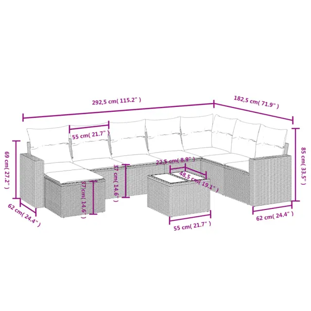 vidaXL Vrtna sedežna garnitura 9-delna z blazinami črn poli ratan