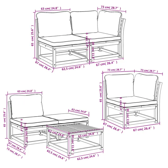 Ta lesena vrtna sedežna garnitura z blazinami ima eleganten dizajn in je odlična izbira za sprostitev in uživanje na vrtu ali terasi.
