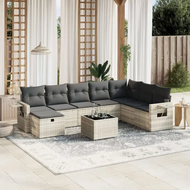 Ta vrtna sedežna garnitura je popoln dodatek za vaše dvorišče, teraso ali verando, saj zagotavlja udoben in vabljiv prostor za klepet z družino in prijatelji ali preprosto za sprostitev in uživanje na prostem. Vzdržljiv material: PE ratan, znan tudi kot poli ratan, je močan sintetični material, ki zahteva malo vzdrževanja in je videti kot naravni ratan. Je lahek, enostaven za čiščenje in se zaradi svoje vzdržljivosti in odpornosti na vremenske vplive pogosto uporablja za zunanje pohištvo.Steklena mizna plošča: Površina zunanje mize je izdelana iz močnega in trpežnega kaljenega stekla, kar omogoča enostavno čiščenje z vlažno krpo in vašemu zunanjemu prostoru doda pridih elegance.Prevleko je mogoče odstraniti in oprati: Te sedežne blazine imajo odstranljive prevleke za lažje pranje in vzdrževanje.Robusten in stabilen okvir: Prašno barvan jekleni okvir zagotavlja, da je vrtno pohištvo močno in stabilno za vsakodnevno uporabo na prostem.Modularna zasnova: Ta komplet zunanjega pohištva ima modularno zasnovo, zaradi česar je popolnoma prilagodljiv in enostaven za premikanje, tako da lahko zunanjo garnituro postavite kakor koli želite. Dobro je vedeti:Če želite, da vaše zunanje pohištvo ostane lepo, vam priporočamo, da ga zaščitite z vodoodporno prevleko.Maksimalna nosilnost (na sedež): 110 kgUV-odpornoPotrebno sestavljanje: DaKotni sedež:Barva: Svetlo sivaMaterial: PE ratan, jeklen okvir s prašnim premazomDimenzije: 62 x 62 x 69 cm (Š x G x V)Velikost sedeža: 55 x 55 cm (Š x G)Višina sedeža, merjena od tal: 37 cmSrednji sedež:Barva: Svetlo sivaMaterial: PE ratan, jeklen okvir s prašnim premazomDimenzije: 55 x 62 x 69 cm (Š x G x V)Velikost sedeža: 55 x 55 cm (Š x G)Višina sedeža, merjena od tal: 37 cmKavč z naslonjali za roke:Barva: Svetlo sivaMaterial: PE ratan, jeklen okvir s prašnim premazomDimenzije: 61,5 x 62 x 69 cm (Š x G x V)Velikost sedeža: 55 x 55 cm (Š x G)Višina sedeža, merjena od tal: 37 cmVišina naslonjal za roke od tal: 55 cmStolček za noge:Barva: Svetlo sivaMaterial: PE ratan, jeklen okvir s prašnim premazomDimenzije: 55 x 55 x 37 cm (Š x G x V)Velikost sedeža: 55 x 55 cm (Š x G)Višina sedeža, merjena od tal: 37 cmMiza:Barva: Svetlo sivaMaterial: PE ratan, jeklo s prašnim premazom, kaljeno stekloDimenzije: 55 x 55 x 37 cm (D x Š x V)Blazina:Barva: Temno sivaMaterial prevleke: Tkanina (100 % poliester)Polnilo sedežne blazine: PenaPolnilo hrbtne blazine: bombažna vlaknaDimenzije sedežne blazine: 55 x 55 x 3 cm (Š x G x D)Dimenzije hrbtne blazine: 55 x 45 x 13 cm (D x Š x D)Paket vsebuje:1 x Kotni sedež4 x Srednji sedež2 x Kavč z naslonjali za roke1 x Stolček za noge1 x Vrtna miza9 x Blazina za hrbet8 x Sedežna blazina s snemljivo in pralno prevleko 3263908