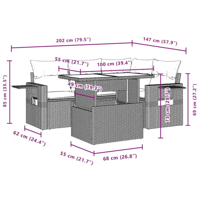 Ta vrtna sedežna garnitura je popoln dodatek za vaše dvorišče, teraso ali verando, saj zagotavlja udoben in vabljiv prostor za klepet z družino in prijatelji ali preprosto za sprostitev in uživanje na prostem. Vzdržljiv material: PE ratan, znan tudi kot poli ratan, je močan sintetični material, ki zahteva malo vzdrževanja in je videti kot naravni ratan. Je lahek, enostaven za čiščenje in se zaradi svoje vzdržljivosti in odpornosti na vremenske vplive pogosto uporablja za zunanje pohištvo.Nastavljiva mizna plošča: Z dvigom mizne plošče lahko mizo povišate, s čimer se zunanja klubska mizica spremeni v jedilno mizo. Popolna je za sprejemanje gostov ali uživanje v obrokih na prostem.Priročna stranska mizica: To zunanje pohištvo ima zložljive stranske mizice s pnevmatsko vzmetjo na naslonjalih za roke, ki zagotavljajo priročen prostor za shranjevanje potrebščin na dosegu roke. Udobno sedenje: To zunanje pohištvo z debelo oblazinjenimi blazinami zagotavlja udobno sedenje.Modularna zasnova: Ta komplet zunanjega pohištva ima modularno zasnovo, zaradi česar je popolnoma prilagodljiv in enostaven za premikanje, tako da lahko zunanjo garnituro postavite kakor koli želite. Dobro je vedeti:Če želite, da vaše zunanje pohištvo ostane lepo, vam priporočamo, da ga zaščitite z vodoodporno prevleko.Maksimalna nosilnost (na sedež): 110 kgUV-odpornoPotrebno sestavljanje: DaKotni sedež:Barva: Svetlo sivaMaterial: PE ratan, jeklen okvir s prašnim premazomDimenzije: 62 x 62 x 69 cm (Š x G x V)Velikost sedeža: 55 x 55 cm (Š x G)Višina sedeža, merjena od tal: 37 cmSrednji sedež:Barva: Svetlo sivaMaterial: PE ratan, jeklen okvir s prašnim premazomDimenzije: 55 x 62 x 69 cm (Š x G x V)Velikost sedeža: 55 x 55 cm (Š x G)Višina sedeža, merjena od tal: 37 cmKavč z naslonjali za roke:Barva: Svetlo sivaMaterial: PE ratan, jeklen okvir s prašnim premazomDimenzije: 61,5/85 x 62 x 69 cm (Š x G x V)Velikost sedeža: 55 x 55 cm (Š x G)Višina sedeža, merjena od tal: 37 cmVišina naslonjal za roke, merjena od tal: 53,5 cmMiza:Barva: Svetlo sivaMaterial: PE ratan, jeklo s prašnim premazom, kaljeno stekloDimenzije: 100 x 55 x 44/73 cm (D x Š x V)Blazina:Barva: Antracitna Material prevleke: Tkanina (100 % poliester)Polnilo sedežne blazine: PenaPolnilo hrbtne blazine: bombažna vlaknaDimenzije sedežne blazine: 55 x 55 x 3 cm (Š x G x D)Dimenzije hrbtne blazine: 55 x 45 x 13 cm (D x Š x D)Paket vsebuje:1 x Kotni sedež1 x Sredinski sedež2 x Kavč z naslonjali za roke1 x Vrtna miza5 x Blazina za hrbet4 x Sedežna blazina s snemljivo in pralno prevleko 3267882