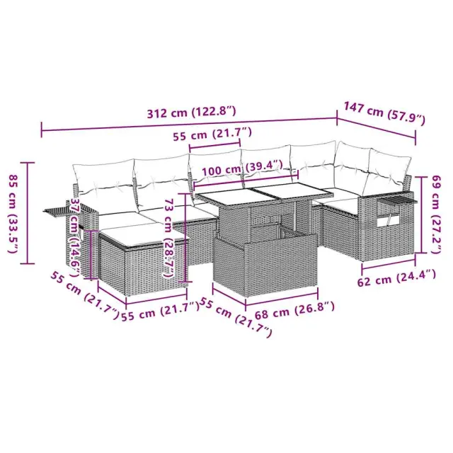 Ta vrtna sedežna garnitura je popoln dodatek za vaše dvorišče, teraso ali verando, saj zagotavlja udoben in vabljiv prostor za klepet z družino in prijatelji ali preprosto za sprostitev in uživanje na prostem. Vzdržljiv material: PE ratan, znan tudi kot poli ratan, je močan sintetični material, ki zahteva malo vzdrževanja in je videti kot naravni ratan. Je lahek, enostaven za čiščenje in se zaradi svoje vzdržljivosti in odpornosti na vremenske vplive pogosto uporablja za zunanje pohištvo.Nastavljiva mizna plošča: Z dvigom mizne plošče lahko mizo povišate, s čimer se zunanja klubska mizica spremeni v jedilno mizo. Popolna je za sprejemanje gostov ali uživanje v obrokih na prostem.Priročna stranska mizica: To zunanje pohištvo ima zložljive stranske mizice s pnevmatsko vzmetjo na naslonjalih za roke, ki zagotavljajo priročen prostor za shranjevanje potrebščin na dosegu roke. Udobno sedenje: To zunanje pohištvo z debelo oblazinjenimi blazinami zagotavlja udobno sedenje.Modularna zasnova: Ta komplet zunanjega pohištva ima modularno zasnovo, zaradi česar je popolnoma prilagodljiv in enostaven za premikanje, tako da lahko zunanjo garnituro postavite kakor koli želite. Dobro je vedeti:Če želite, da vaše zunanje pohištvo ostane lepo, vam priporočamo, da ga zaščitite z vodoodporno prevleko.Maksimalna nosilnost (na sedež): 110 kgUV-odpornoPotrebno sestavljanje: DaKotni sedež:Barva: Svetlo sivaMaterial: PE ratan, jeklen okvir s prašnim premazomDimenzije: 62 x 62 x 69 cm (Š x G x V)Velikost sedeža: 55 x 55 cm (Š x G)Višina sedeža, merjena od tal: 37 cmSrednji sedež:Barva: Svetlo sivaMaterial: PE ratan, jeklen okvir s prašnim premazomDimenzije: 55 x 62 x 69 cm (Š x G x V)Velikost sedeža: 55 x 55 cm (Š x G)Višina sedeža, merjena od tal: 37 cmKavč z naslonjali za roke:Barva: Svetlo sivaMaterial: PE ratan, jeklen okvir s prašnim premazomDimenzije: 61,5/85 x 62 x 69 cm (Š x G x V)Velikost sedeža: 55 x 55 cm (Š x G)Višina sedeža, merjena od tal: 37 cmVišina naslonjal za roke, merjena od tal: 53,5 cmStolček za noge:Barva: Svetlo sivaMaterial: PE ratan, jeklen okvir s prašnim premazomDimenzije: 55 x 55 x 37 cm (Š x G x V)Velikost sedeža: 55 x 55 cm (Š x G)Višina sedeža, merjena od tal: 37 cmMiza:Barva: Svetlo sivaMaterial: PE ratan, jeklo s prašnim premazom, kaljeno stekloDimenzije: 100 x 55 x 44/73 cm (D x Š x V)Blazina:Barva: Antracitna Material prevleke: Tkanina (100 % poliester)Polnilo sedežne blazine: PenaPolnilo hrbtne blazine: bombažna vlaknaDimenzije sedežne blazine: 55 x 55 x 3 cm (Š x G x D)Dimenzije hrbtne blazine: 55 x 45 x 13 cm (D x Š x D)Paket vsebuje:1 x Kotni sedež3 x Srednji sedež2 x Kavč z naslonjali za roke1 x Stolček za noge1 x Vrtna miza7 x Hrbtna blazina7 x Sedežna blazina s snemljivo in pralno prevleko 3268062