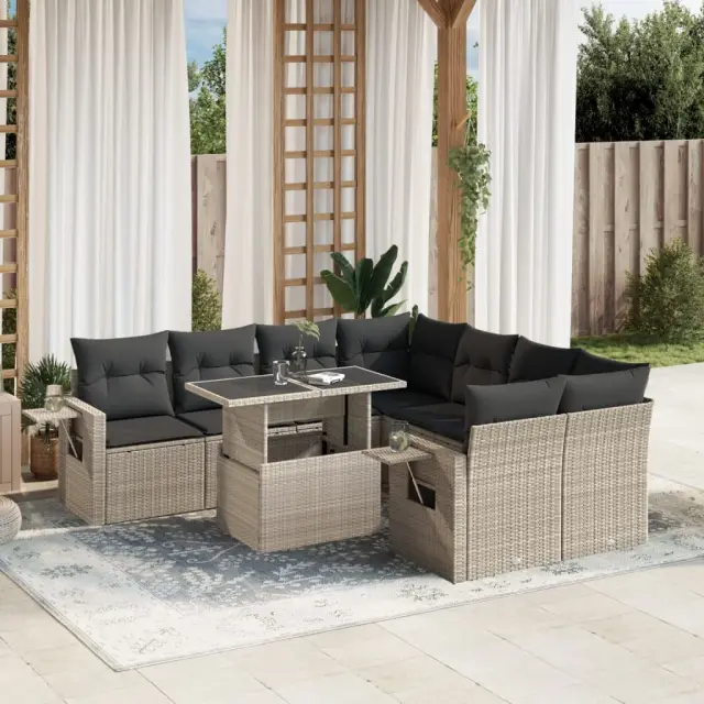 Ta vrtna sedežna garnitura je popoln dodatek za vaše dvorišče, teraso ali verando, saj zagotavlja udoben in vabljiv prostor za klepet z družino in prijatelji ali preprosto za sprostitev in uživanje na prostem. Vzdržljiv material: PE ratan, znan tudi kot poli ratan, je močan sintetični material, ki zahteva malo vzdrževanja in je videti kot naravni ratan. Je lahek, enostaven za čiščenje in se zaradi svoje vzdržljivosti in odpornosti na vremenske vplive pogosto uporablja za zunanje pohištvo.Nastavljiva mizna plošča: Z dvigom mizne plošče lahko mizo povišate, s čimer se zunanja klubska mizica spremeni v jedilno mizo. Popolna je za sprejemanje gostov ali uživanje v obrokih na prostem.Priročna stranska mizica: To zunanje pohištvo ima zložljive stranske mizice s pnevmatsko vzmetjo na naslonjalih za roke, ki zagotavljajo priročen prostor za shranjevanje potrebščin na dosegu roke. Udobno sedenje: To zunanje pohištvo z debelo oblazinjenimi blazinami zagotavlja udobno sedenje.Modularna zasnova: Ta komplet zunanjega pohištva ima modularno zasnovo, zaradi česar je popolnoma prilagodljiv in enostaven za premikanje, tako da lahko zunanjo garnituro postavite kakor koli želite. Dobro je vedeti:Če želite, da vaše zunanje pohištvo ostane lepo, vam priporočamo, da ga zaščitite z vodoodporno prevleko.Maksimalna nosilnost (na sedež): 110 kgUV-odpornoPotrebno sestavljanje: DaKotni sedež:Barva: Svetlo sivaMaterial: PE ratan, jeklen okvir s prašnim premazomDimenzije: 62 x 62 x 69 cm (Š x G x V)Velikost sedeža: 55 x 55 cm (Š x G)Višina sedeža, merjena od tal: 37 cmSrednji sedež:Barva: Svetlo sivaMaterial: PE ratan, jeklen okvir s prašnim premazomDimenzije: 55 x 62 x 69 cm (Š x G x V)Velikost sedeža: 55 x 55 cm (Š x G)Višina sedeža, merjena od tal: 37 cmKavč z naslonjali za roke:Barva: Svetlo sivaMaterial: PE ratan, jeklen okvir s prašnim premazomDimenzije: 61,5/85 x 62 x 69 cm (Š x G x V)Velikost sedeža: 55 x 55 cm (Š x G)Višina sedeža, merjena od tal: 37 cmVišina naslonjal za roke, merjena od tal: 53,5 cmMiza:Barva: Svetlo sivaMaterial: PE ratan, jeklo s prašnim premazom, kaljeno stekloDimenzije: 100 x 55 x 44/73 cm (D x Š x V)Blazina:Barva: Antracitna Material prevleke: Tkanina (100 % poliester)Polnilo sedežne blazine: PenaPolnilo hrbtne blazine: bombažna vlaknaDimenzije sedežne blazine: 55 x 55 x 3 cm (Š x G x D)Dimenzije hrbtne blazine: 55 x 45 x 13 cm (D x Š x D)Paket vsebuje:2 x Kotni sedež4 x Srednji sedež2 x Kavč z naslonjali za roke1 x Vrtna miza10 x Blazina za hrbet8 x Sedežna blazina s snemljivo in pralno prevleko 3267802
