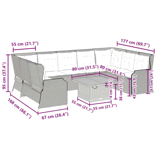 Ta vrtna sedežna garnitura je popoln dodatek za vaše dvorišče, teraso ali verando, saj zagotavlja udoben in vabljiv prostor za klepet z družino in prijatelji ali preprosto za sprostitev in uživanje na prostem.