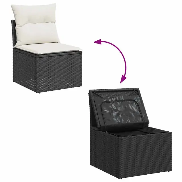 Ta vrtna sedežna garnitura je popoln dodatek za vaše dvorišče, teraso ali verando, saj zagotavlja udoben in vabljiv prostor za klepet z družino in prijatelji ali preprosto za sprostitev in uživanje na prostem. Trpežen material: PE ratan, znan tudi kot poli ratan, je močan sintetični material, ki ne potrebuje vzdrževanja in je videti kot naravni ratan. Je lahek, enostaven za čiščenje in se zaradi svoje vzdržljivosti in odpornosti na vremenske vplive pogosto uporablja za zunanje pohištvo.Funkcija shranjevanja z vodoodporno torbo: Vrtno pohištvo ima pod sedežem prostor za shranjevanje, opremljen z vodoodporno torbo za shranjevanje blazin, igrač in drugih stvari. Notranjo torbo je mogoče varno pritrditi na zunanje pohištvo s kavljem in zanko za večjo stabilnost.Vsestranski stolček za noge: Stolček je vsestransko uporaben, saj služi kot udoben naslon za noge, ko ležite na kavču, ali kot dodaten sedež na vrtu.Prevleko je mogoče odstraniti in oprati: Te sedežne blazine imajo odstranljive prevleke za lažje pranje in vzdrževanje.Modularna zasnova: Ta komplet zunanjega pohištva ima modularno zasnovo, zaradi česar je popolnoma prilagodljiv in enostaven za premikanje, tako da lahko zunanjo garnituro postavite kakor koli želite. Dobro je vedeti:Če želite, da vaše zunanje pohištvo ostane lepo, vam priporočamo, da ga zaščitite z vodoodporno prevleko.Dimenzije vodoodporne vreče: 55 x 53 x 34 cm (D x Š x V)Največja dovoljena teža (na sedež): 110 kgUV-odpornoPlastične nastavljive nogePotrebno sestavljanje: DaKotni sedež:Barva: ČrnaMaterial: PE ratan, jeklen okvir s prašnim premazomDimenzije: 62 x 62 x 69 cm (Š x G x V)Velikost sedeža: 55 x 55 cm (Š x G)Višina sedeža od tal (brez blazine): 37 cmSrednji sedež:Barva: ČrnaMaterial: PE ratan, jeklen okvir s prašnim premazomDimenzije: 55 x 62 x 69 cm (Š x G x V)Velikost sedeža: 55 x 55 cm (Š x G)Višina sedeža od tal (brez blazine): 37 cmStolček za noge:Barva: ČrnaMaterial: PE ratan, jeklen okvir s prašnim premazomDimenzije: 55 x 55 x 37 cm (Š x G x V)Vrtna miza:Barva: Črna in rjavaMaterial: PE ratan, prašno premazano jeklo, trden akacijev les z oljnim premazomDimenzije: 55 x 55 x 37 cm (Š x G x V)Blazina:Barva: Kremno belaMaterial prevleke: Tkanina (100 % poliester)Polnilo sedežne blazine: PenaPolnilo hrbtne blazine: bombažna vlaknaDimenzije sedežne blazine: 55 x 55 x 3 cm (Š x G x D)Dimenzije hrbtne blazine: 55 x 45 x 13 cm (D x Š x D) Paket vsebuje:2 x Kotni kavč s funkcijo shranjevanja z vodoodporno vrečo2 x Srednji kavč s funkcijo shranjevanja z vodoodporno vrečo1 x Stolček s funkcijo shranjevanja1 x Vrtna miza6 x Blazina za hrbet5 x Sedežna blazina s snemljivo pralno prevleko 3325752