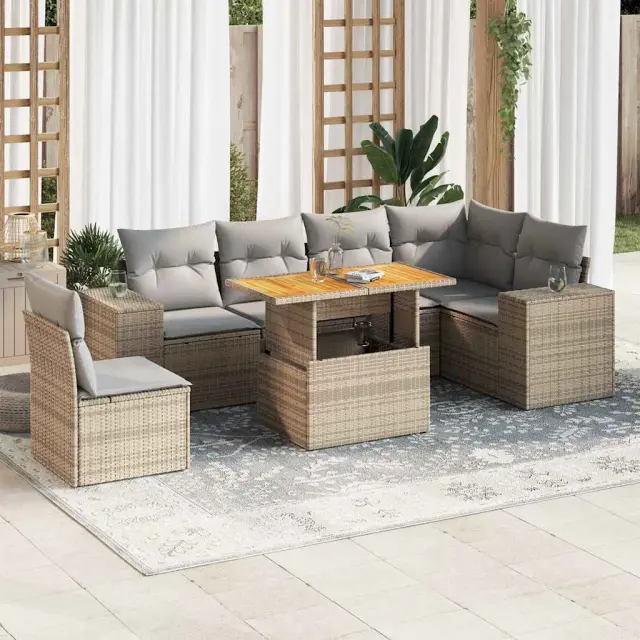 Ta vrtna sedežna garnitura je popoln dodatek za vaše dvorišče, teraso ali verando, saj zagotavlja udoben in vabljiv prostor za klepet z družino in prijatelji ali preprosto za sprostitev in uživanje na prostem. Trpežen material: PE ratan, znan tudi kot poli ratan, je močan sintetični material, ki ne potrebuje vzdrževanja in je videti kot naravni ratan. Je lahek, enostaven za čiščenje in se zaradi svoje vzdržljivosti in odpornosti na vremenske vplive pogosto uporablja za zunanje pohištvo.Funkcija shranjevanja z vodoodporno torbo: Vrtno pohištvo ima pod sedežem prostor za shranjevanje, opremljen z vodoodporno torbo za shranjevanje blazin, igrač in drugih stvari. Notranjo torbo je mogoče varno pritrditi na zunanje pohištvo s kavljem in zanko za večjo stabilnost.Nastavljiva mizna plošča: Z dvigom mizne plošče lahko mizo povišate, s čimer se zunanja klubska mizica spremeni v jedilno mizo. Popolna je za sprejemanje gostov ali uživanje v obrokih na prostem.Prevleko je mogoče odstraniti in oprati: Te sedežne blazine imajo odstranljive prevleke za lažje pranje in vzdrževanje.Modularna zasnova: Ta komplet zunanjega pohištva ima modularno zasnovo, zaradi česar je popolnoma prilagodljiv in enostaven za premikanje, tako da lahko zunanjo garnituro postavite kakor koli želite. Dobro je vedeti:Če želite, da vaše zunanje pohištvo ostane lepo, vam priporočamo, da ga zaščitite z vodoodporno prevleko.Dimenzije vodoodporne vreče: 55 x 53 x 34 cm (D x Š x V)Maksimalna nosilnost (na sedež): 110 kgUV-odpornoPlastične nastavljive nogePotrebno sestavljanje: DaKotni sedež:Barva: BežMaterial: PE ratan, jeklen okvir s prašnim premazomDimenzije: 62 x 62 x 69 cm (Š x G x V)Velikost sedeža: 55 x 55 cm (Š x G)Višina sedeža od tal (brez blazine): 37 cmKotni sedež s naslonom za roke iz ratana:Barva: BežMaterial: PE ratan, jeklen okvir s prašnim premazomDimenzije: 83 x 62 x 69 cm (Š x G x V)Velikost sedeža: 55 x 55 cm (Š x G)Višina sedeža od tal (brez blazine): 37 cmVišina naslonjal za roke od tal: 55 cmŠirina naslona za roke: 27,5 cmSrednji sedež:Barva: BežMaterial: PE ratan, jeklen okvir s prašnim premazomDimenzije: 55 x 62 x 69 cm (Š x G x V)Velikost sedeža: 55 x 55 cm (Š x G)Višina sedeža od tal (brez blazine): 37 cmMiza:Barva: BežMaterial: PE ratan, prašno premazano jeklo, trden akacijev les z oljnim premazomDimenzije: 100 x 55 x 44/73 cm (D x Š x V)Blazina:Barva: Svetlo sivaMaterial prevleke: Tkanina (100 % poliester)Polnilo sedežne blazine: PenaPolnilo hrbtne blazine: bombažna vlaknaDimenzije sedežne blazine: 55 x 55 x 3 cm (Š x G x D)Dimenzije hrbtne blazine: 55 x 45 x 13 cm (D x Š x D)Paket vsebuje:1 x Vrtna miza1 x Kotni kavč s funkcijo shranjevanja z vodoodporno vrečo2 x Kotni sedež z naslonom za roke iz ratana s funkcijo shranjevanja z vodoodporno torbo3 x Srednji kavč s funkcijo shranjevanja z vodoodporno vrečo7 x Hrbtna blazina6 x Sedežna blazina s snemljivo pralno prevleko 3327384