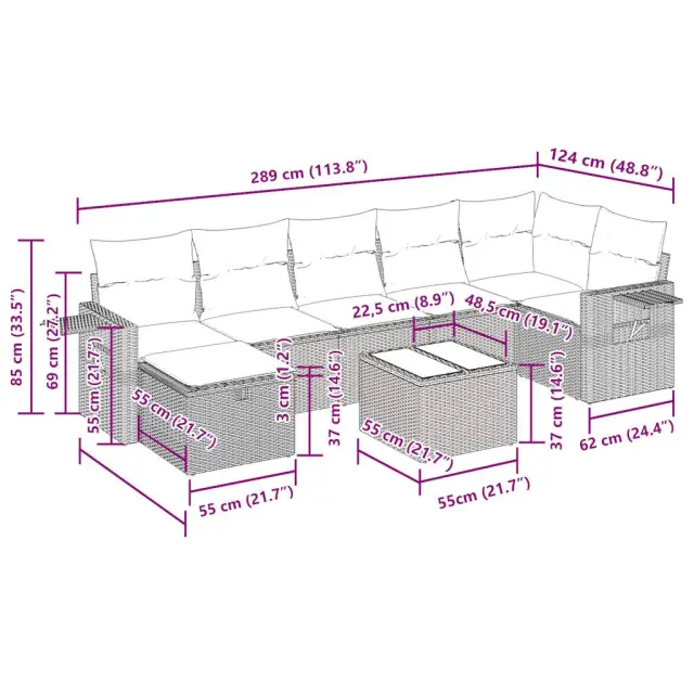 Ta vrtna sedežna garnitura je popoln dodatek za vaše dvorišče, teraso ali verando, saj zagotavlja udoben in vabljiv prostor za klepet z družino in prijatelji ali preprosto za sprostitev in uživanje na prostem. Trpežen material: PE ratan, znan tudi kot poli ratan, je močan sintetični material, ki ne potrebuje vzdrževanja in je videti kot naravni ratan. Je lahek, enostaven za čiščenje in se zaradi svoje vzdržljivosti in odpornosti na vremenske vplive pogosto uporablja za zunanje pohištvo.Funkcija shranjevanja z vodoodporno torbo: Vrtno pohištvo ima pod sedežem prostor za shranjevanje, opremljen z vodoodporno torbo za shranjevanje blazin, igrač in drugih stvari. Notranjo torbo je mogoče varno pritrditi na zunanje pohištvo s kavljem in zanko za večjo stabilnost.Vsestranski stolček za noge: Stolček je vsestransko uporaben, saj služi kot udoben naslon za noge, ko ležite na kavču, ali kot dodaten sedež na vrtu.Prevleko je mogoče odstraniti in oprati: Te sedežne blazine imajo odstranljive prevleke za lažje pranje in vzdrževanje.Modularna zasnova: Ta komplet zunanjega pohištva ima modularno zasnovo, zaradi česar je popolnoma prilagodljiv in enostaven za premikanje, tako da lahko zunanjo garnituro postavite kakor koli želite. Dobro je vedeti:Če želite, da vaše zunanje pohištvo ostane lepo, vam priporočamo, da ga zaščitite z vodoodporno prevleko.Dimenzije vodoodporne vreče: 55 x 53 x 34 cm (D x Š x V)Največja dovoljena teža (na sedež): 110 kgUV-odpornoPlastične nastavljive nogePotrebno sestavljanje: DaKavč z naslonjali za roke:Barva: BežMaterial: PE ratan, jeklen okvir s prašnim premazomDimenzije: 62 x 62 x 69 cm (Š x G x V)Velikost sedeža: 55 x 55 cm (Š x G)Višina sedeža od tal (brez blazine): 37 cmVišina naslonjal za roke od tal: 55 cmŠirina naslonjala za roke: 6 cmVelikost stranske mizice: 25 x 23 cm (D x Š)Kotni sedež:Barva: BežMaterial: PE ratan, jeklen okvir s prašnim premazomDimenzije: 62 x 62 x 69 cm (Š x G x V)Velikost sedeža: 55 x 55 cm (Š x G)Višina sedeža od tal (brez blazine): 37 cmSrednji sedež:Barva: BežMaterial: PE ratan, jeklen okvir s prašnim premazomDimenzije: 55 x 62 x 69 cm (Š x G x V)Velikost sedeža: 55 x 55 cm (Š x G)Višina sedeža od tal (brez blazine): 37 cmStolček za noge:Barva: BežMaterial: PE ratan, jeklen okvir s prašnim premazomDimenzije: 55 x 55 x 37 cm (Š x G x V)Vrtna miza:Barva: BežMaterial: PE ratan, jeklo s prašnim premazom, kaljeno stekloDimenzije: 55 x 55 x 37 cm (Š x G x V)Blazina:Barva: Kremno belaMaterial prevleke: Tkanina (100 % poliester)Polnilo sedežne blazine: PenaPolnilo hrbtne blazine: bombažna vlaknaDimenzije sedežne blazine: 55 x 55 x 3 cm (Š x G x D)Dimenzije hrbtne blazine: 55 x 45 x 13 cm (D x Š x D)Paket vsebuje:2 x Kavč s funkcijo shranjevanja z vodoodporno vrečo1 x Kotni kavč s funkcijo shranjevanja z vodoodporno vrečo3 x Srednji kavč s funkcijo shranjevanja z vodoodporno vrečo1 x Stolček s funkcijo shranjevanja1 x Vrtna miza7 x Hrbtna blazina7 x Sedežna blazina s snemljivo in pralno prevleko 3325514