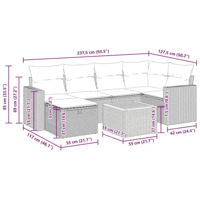 vidaXL Vrtna sedežna garnitura 7-delna z blazinami črn poli ratan
