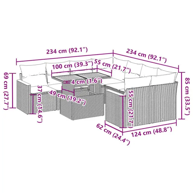 Ta vrtna sedežna garnitura je popoln dodatek za vaše dvorišče, teraso ali verando, saj zagotavlja udoben in vabljiv prostor za klepet z družino in prijatelji ali preprosto za sprostitev in uživanje na prostem.Trpežen material: PE ratan, znan tudi kot poli ratan, je močan sintetični material, ki ne potrebuje vzdrževanja in je videti kot naravni ratan. Je lahek, enostaven za čiščenje in se zaradi svoje vzdržljivosti in odpornosti na vremenske vplive pogosto uporablja za zunanje pohištvo.Funkcija shranjevanja z vodoodporno vrečo: Vsak vrtni sedež ima prostor za shranjevanje pod sedežem, skupaj z vodoodporno vrečo za shranjevanje blazin, igrač in drugih predmetov. Notranje vreče imajo zgornjo prevleko in jih je mogoče s pomočjo primenjal varno pritrditi na sedeže za dodatno varnost.Prevleko je mogoče odstraniti in oprati: Te sedežne blazine imajo odstranljive prevleke za lažje pranje in vzdrževanje.Modularna zasnova: Ta komplet zunanjega pohištva ima modularno zasnovo, zaradi česar je popolnoma prilagodljiv in enostaven za premikanje, tako da lahko zunanjo garnituro postavite kakor koli želite.Dobro je vedeti:Če želite, da vaše zunanje pohištvo ostane lepo, vam priporočamo, da ga zaščitite z vodoodporno prevleko.Največja dovoljena teža (na sedež): 110 kgUV-odpornoPlastične nastavljive nogePotrebno sestavljanje: DaKotni sedež:Barva: BežMaterial: PE ratan, jeklen okvir s prašnim premazomDimenzije: 62 x 62 x 69 cm (Š x G x V)Velikost sedeža: 55 x 55 cm (Š x G)Višina sedeža od tal (brez blazine): 37 cmSrednji sedež:Barva: BežMaterial: PE ratan, jeklen okvir s prašnim premazomDimenzije: 55 x 62 x 69 cm (Š x G x V)Velikost sedeža: 55 x 55 cm (Š x G)Višina sedeža od tal (brez blazine): 37 cmKotni sedež s naslonom za roke iz ratana:Barva: BežMaterial: PE ratan, prašno premazano jeklo, trden akacijev les z oljnim premazomDimenzije: 62 x 62 x 69 cm (Š x G x V)Velikost sedeža: 55 x 55 cm (Š x G)Višina sedeža od tal (brez blazine): 37 cmVišina naslonjal za roke od tal: 55 cmMiza:Barva: BežMaterial: PE ratan, prašno premazano jeklo, trden akacijev les z oljnim premazomDimenzije: 100 x 55 x 44/73 cm (D x Š x V)Blazina:Barva: Svetlo sivaMaterial prevleke: Tkanina (100 % poliester)Polnilo sedežne blazine: PenaPolnilo hrbtne blazine: bombažna vlaknaDimenzije sedežne blazine: 55 x 55 x 3 cm (Š x G x D)Dimenzije hrbtne blazine: 55 x 45 x 13 cm (D x Š x D)Paket vsebuje:1 x Vrtna miza2 x Kotni kavč s funkcijo shranjevanja z vodoodporno vrečo2 x Kotni sedež z naslonom za roke iz ratana s funkcijo shranjevanja z vodoodporno torbo4 x Srednji kavč s funkcijo shranjevanja z vodoodporno vrečo8 x Sedežna blazina s snemljivo in pralno prevleko10 x Blazina za hrbet 3327468