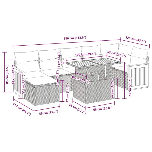 Ta vrtna sedežna garnitura je popoln dodatek za vaše dvorišče, teraso ali verando, saj zagotavlja udoben in vabljiv prostor za klepet z družino in prijatelji ali preprosto za sprostitev in uživanje na prostem.Trpežen material: PE ratan, znan tudi kot poli ratan, je močan sintetični material, ki ne potrebuje vzdrževanja in je videti kot naravni ratan. Je lahek, enostaven za čiščenje in se zaradi svoje vzdržljivosti in odpornosti na vremenske vplive pogosto uporablja za zunanje pohištvo.Funkcija shranjevanja z vodoodporno vrečo: Vsak vrtni sedež ima prostor za shranjevanje pod sedežem, skupaj z vodoodporno vrečo za shranjevanje blazin, igrač in drugih predmetov. Notranje vreče imajo zgornjo prevleko in jih je mogoče s pomočjo primenjal varno pritrditi na sedeže za dodatno varnost.Prevleko je mogoče odstraniti in oprati: Te sedežne blazine imajo odstranljive prevleke za lažje pranje in vzdrževanje.Modularna zasnova: Ta komplet zunanjega pohištva ima modularno zasnovo, zaradi česar je popolnoma prilagodljiv in enostaven za premikanje, tako da lahko zunanjo garnituro postavite kakor koli želite.Dobro je vedeti:Če želite, da vaše zunanje pohištvo ostane lepo, vam priporočamo, da ga zaščitite z vodoodporno prevleko.Dimenzije vodoodporne vreče: 55 x 53 x 34 cm (D x Š x V)Največja dovoljena teža (na sedež): 110 kgUV-odpornoPlastične nastavljive nogePotrebno sestavljanje: DaSrednji sedež:Barva: BežMaterial: PE ratan, jeklen okvir s prašnim premazomDimenzije: 55 x 62 x 69 cm (Š x G x V)Velikost sedeža: 55 x 55 cm (Š x G)Višina sedeža od tal (brez blazine): 37 cmKotni sedež:Barva: BežMaterial: PE ratan, jeklen okvir s prašnim premazomDimenzije: 62 x 62 x 69 cm (Š x G x V)Velikost sedeža: 55 x 55 cm (Š x G)Višina sedeža od tal (brez blazine): 37 cmKavč z naslonjali za roke:Barva: BežMaterial: PE ratan, prašno premazano jeklo, trden akacijev les z oljnim premazomDimenzije: 59 x 62 x 69 cm (Š x G x V)Velikost sedeža: 55 x 55 cm (Š x G)Višina sedeža od tal (brez blazine): 37 cmMiza:Barva: BežMaterial: PE ratan, prašno premazano jeklo, trden akacijev les z oljnim premazomDimenzije: 100 x 55 x 44/73 cm (D x Š x V)Stolček za noge:Barva: BežMaterial: PE ratan, jeklen okvir s prašnim premazomDimenzije: 55 x 55 x 37 cm (Š x G x V)Blazina:Barva: BelaMaterial prevleke: Tkanina (100 % poliester)Polnilo sedežne blazine: PenaPolnilo hrbtne blazine: bombažna vlaknaDimenzije sedežne blazine: 55 x 55 x 3 cm (Š x G x D)Dimenzije hrbtne blazine: 55 x 45 x 13 cm (D x Š x D)Paket vsebuje:3 x Srednji kavč s funkcijo shranjevanja z vodoodporno vrečo1 x Kotni kavč s funkcijo shranjevanja z vodoodporno vrečo2 x Kavč s funkcijo shranjevanja z vodoodporno vrečo1 x Miza1 x Stolček s funkcijo shranjevanja7 x Hrbtna blazina7 x Sedežna blazina s snemljivo in pralno prevleko 3327740