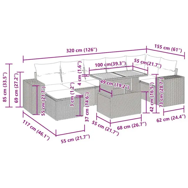 Ta vrtna sedežna garnitura je popoln dodatek za vaše dvorišče, teraso ali verando, saj zagotavlja udoben in vabljiv prostor za klepet z družino in prijatelji ali preprosto za sprostitev in uživanje na prostem. Trpežen material: PE ratan, znan tudi kot poli ratan, je močan sintetični material, ki ne potrebuje vzdrževanja in je videti kot naravni ratan. Je lahek, enostaven za čiščenje in se zaradi svoje vzdržljivosti in odpornosti na vremenske vplive pogosto uporablja za zunanje pohištvo.Funkcija shranjevanja z vodoodporno torbo: Vrtno pohištvo ima pod sedežem prostor za shranjevanje, opremljen z vodoodporno torbo za shranjevanje blazin, igrač in drugih stvari. Notranjo torbo je mogoče varno pritrditi na zunanje pohištvo s kavljem in zanko za večjo stabilnost.Nastavljiva mizna plošča: Z dvigom mizne plošče lahko mizo povišate, s čimer se zunanja klubska mizica spremeni v jedilno mizo. Popolna je za sprejemanje gostov ali uživanje v obrokih na prostem.Prevleko je mogoče odstraniti in oprati: Te sedežne blazine imajo odstranljive prevleke za lažje pranje in vzdrževanje.Modularna zasnova: Ta komplet zunanjega pohištva ima modularno zasnovo, zaradi česar je popolnoma prilagodljiv in enostaven za premikanje, tako da lahko zunanjo garnituro postavite kakor koli želite. Dobro je vedeti:Če želite, da vaše zunanje pohištvo ostane lepo, vam priporočamo, da ga zaščitite z vodoodporno prevleko.Dimenzije vodoodporne vreče: 55 x 53 x 34 cm (D x Š x V)Maksimalna nosilnost (na sedež): 110 kgUV-odpornoPlastične nastavljive nogePotrebno sestavljanje: DaKotni sedež:Barva: BežMaterial: PE ratan, jeklen okvir s prašnim premazomDimenzije: 62 x 62 x 69 cm (Š x G x V)Velikost sedeža: 55 x 55 cm (Š x G)Višina sedeža od tal (brez blazine): 37 cmKotni sedež s naslonom za roke iz ratana:Barva: BežMaterial: PE ratan, jeklen okvir s prašnim premazomDimenzije: 83 x 62 x 69 cm (Š x G x V)Velikost sedeža: 55 x 55 cm (Š x G)Višina sedeža od tal (brez blazine): 37 cmVišina naslonjal za roke od tal: 55 cmŠirina naslona za roke: 27,5 cmSrednji sedež:Barva: BežMaterial: PE ratan, jeklen okvir s prašnim premazomDimenzije: 55 x 62 x 69 cm (Š x G x V)Velikost sedeža: 55 x 55 cm (Š x G)Višina sedeža od tal (brez blazine): 37 cmStolček za noge:Barva: BežMaterial: PE ratan, jeklen okvir s prašnim premazomDimenzije: 55 x 55 x 37 cm (Š x G x V)Miza:Barva: BežMaterial: PE ratan, prašno premazano jeklo, trden akacijev les z oljnim premazomDimenzije: 100 x 55 x 44/73 cm (D x Š x V)Blazina:Barva: Kremno belaMaterial prevleke: Tkanina (100 % poliester)Polnilo sedežne blazine: PenaPolnilo hrbtne blazine: bombažna vlaknaDimenzije sedežne blazine: 55 x 55 x 3 cm (Š x G x D)Dimenzije hrbtne blazine: 55 x 45 x 13 cm (D x Š x D)Paket vsebuje:1 x Vrtna miza1 x Kotni kavč s funkcijo shranjevanja z vodoodporno vrečo2 x Kotni sedež z naslonom za roke iz ratana s funkcijo shranjevanja z vodoodporno torbo3 x Srednji kavč s funkcijo shranjevanja z vodoodporno vrečo1 x Stolček za noge s funkcijo shranjevanja z vodoodporno vrečo7 x Hrbtna blazina7 x Sedežna blazina s snemljivo in pralno prevleko 3327404