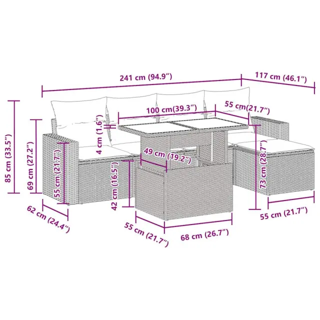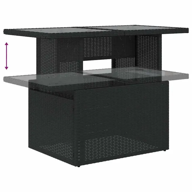 Ta vrtna sedežna garnitura je popoln dodatek za vaše dvorišče, teraso ali verando, saj zagotavlja udoben in vabljiv prostor za klepet z družino in prijatelji ali preprosto za sprostitev in uživanje na prostem. Trpežen material: PE ratan, znan tudi kot poli ratan, je močan sintetični material, ki ne potrebuje vzdrževanja in je videti kot naravni ratan. Je lahek, enostaven za čiščenje in se zaradi svoje vzdržljivosti in odpornosti na vremenske vplive pogosto uporablja za zunanje pohištvo.Funkcija shranjevanja z vodoodporno vrečo: Vsak vrtni sedež ima pod sedežem prostor za shranjevanje, opremljen z vodoodporno vrečo za shranjevanje blazin, igrač in drugih predmetov. Notranja torba ima zgornji pokrov in jo je mogoče varno pritrditi na sedež s kavljem in zanko za večjo stabilnost.Nastavljiva mizna plošča: Z dvigom mizne plošče lahko mizo povišate, s čimer se zunanja klubska mizica spremeni v jedilno mizo. Popolna je za sprejemanje gostov ali uživanje v obrokih na prostem.Vsestranski stolček za noge: Stolček je vsestransko uporaben, saj služi kot udoben naslon za noge, ko ležite na kavču, ali kot dodaten sedež na vrtu.Prevleko je mogoče odstraniti in oprati: Te sedežne blazine imajo odstranljive prevleke za lažje pranje in vzdrževanje.Robusten in stabilen okvir: Jeklen okvir s prašnim premazom je močan, stabilen, trpežen ter odporen na korozijo in slabe vremenske razmere, kar zagotavlja dolgotrajno delovanje. Dobro je vedeti:Če želite, da vaše zunanje pohištvo ostane lepo, vam priporočamo, da ga zaščitite z vodoodporno prevleko.Dimenzije vodoodporne vreče: 55 x 53 x 34 cm (D x Š x V)Največja dovoljena teža (na sedež): 110 kgUV-odpornoPlastične nastavljive nogePotrebno sestavljanje: DaSrednji sedež:Barva: ČrnaMaterial: PE ratan, jeklen okvir s prašnim premazomDimenzije: 55 x 62 x 69 cm (Š x G x V)Velikost sedeža: 55 x 55 cm (Š x G)Višina sedeža od tal (brez blazine): 37 cmKavč z naslonjali za roke:Barva: ČrnaMaterial: PE ratan, jeklen okvir s prašnim premazomDimenzije: 65,5 x 62 x 69 cm (Š x G x V)Velikost sedeža: 55 x 55 cm (Š x G)Višina sedeža od tal (brez blazine): 37 cmVišina naslonjal za roke od tal: 55 cmStolček za noge:Barva: ČrnaMaterial: PE ratan, jeklen okvir s prašnim premazomDimenzije: 55 x 55 x 37 cm (Š x G x V)Miza:Barva: ČrnaMaterial: PE ratan, jeklo s prašnim premazom, kaljeno stekloDimenzije: 100 x 55 x 44/73 cm (D x Š x V)Blazina:Barva: Kremno belaMaterial prevleke: Tkanina (100 % poliester)Polnilo sedežne blazine: PenaPolnilo hrbtne blazine: bombažna vlaknaDimenzije sedežne blazine: 55 x 55 x 3 cm (Š x G x D)Dimenzije hrbtne blazine: 55 x 45 x 13 cm (D x Š x D)Paket vsebuje:2 x Srednji kavč s funkcijo shranjevanja z vodoodporno vrečo2 x Kavč s funkcijo shranjevanja z vodoodporno vrečo1 x Stolček za noge s funkcijo shranjevanja z vodoodporno vrečo1 x Miza4 x Blazina za hrbet5 x Sedežna blazina s snemljivo pralno prevleko 3326297