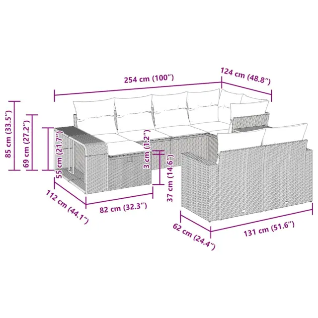 Ta vrtna sedežna garnitura je popoln dodatek za vaše dvorišče, teraso ali verando, saj zagotavlja udoben in vabljiv prostor za klepet z družino in prijatelji ali preprosto za sprostitev in uživanje na prostem. Trpežen material: PE ratan, znan tudi kot poli ratan, je močan sintetični material, ki ne potrebuje vzdrževanja in je videti kot naravni ratan. Je lahek, enostaven za čiščenje in se zaradi svoje vzdržljivosti in odpornosti na vremenske vplive pogosto uporablja za zunanje pohištvo.Funkcija shranjevanja z vodoodporno vrečo: Vsak vrtni sedež ima pod sedežem prostor za shranjevanje, opremljen z vodoodporno vrečo za shranjevanje blazin, igrač in drugih predmetov. Notranja torba ima zgornji pokrov in jo je mogoče varno pritrditi na sedež s kavljem in zanko za večjo stabilnost.Vsestranski stolček za noge: Stolček je vsestransko uporaben, saj služi kot udoben naslon za noge, ko ležite na kavču, ali kot dodaten sedež na vrtu.Prevleko je mogoče odstraniti in oprati: Te sedežne blazine imajo odstranljive prevleke za lažje pranje in vzdrževanje.Robusten in stabilen okvir: Jeklen okvir s prašnim premazom je močan, stabilen, trpežen ter odporen na korozijo in slabe vremenske razmere, kar zagotavlja dolgotrajno delovanje. Dobro je vedeti:Če želite, da vaše zunanje pohištvo ostane lepo, vam priporočamo, da ga zaščitite z vodoodporno prevleko.Dimenzije vodoodporne vreče: 55 x 53 x 34 cm (D x Š x V)Največja dovoljena teža (na sedež): 110 kgUV-odpornoPlastične nastavljive nogePotrebno sestavljanje: DaSrednji sedež:Barva: RjavaMaterial: PE ratan, jeklen okvir s prašnim premazomDimenzije: 55 x 62 x 69 cm (Š x G x V)Velikost sedeža: 55 x 55 cm (Š x G)Višina sedeža od tal (brez blazine): 37 cmKotni sedež:Barva: RjavaMaterial: PE ratan, jeklen okvir s prašnim premazomDimenzije: 62 x 62 x 69 cm (Š x G x V)Velikost sedeža: 55 x 55 cm (Š x G)Višina sedeža od tal (brez blazine): 37 cmKavč z naslonjali za roke:Barva: RjavaMaterial: PE ratan, jeklen okvir s prašnim premazomDimenzije: 65,5 x 62 x 69 cm (Š x G x V)Velikost sedeža: 55 x 55 cm (Š x G)Višina sedeža od tal (brez blazine): 37 cmVišina naslonjal za roke od tal (brez blazine): 55 cmStolček za noge:Barva: RjavaMaterial: PE ratan, jeklen okvir s prašnim premazomDimenzije: 55 x 55 x 37 cm (Š x G x V)Polica za shranjevanje:Barva: RjavaMaterial: PE ratan, jeklen okvir s prašnim premazomDimenzije (L): 112 x 27 x 55 cm (D x Š x V)Dimenzije (S): 58 x 27 x 55 cm (D x Š x V)Blazina:Barva: Kremno belaMaterial prevleke: Tkanina (100 % poliester)Polnilo sedežne blazine: PenaPolnilo hrbtne blazine: bombažna vlaknaDimenzije sedežne blazine: 55 x 55 x 3 cm (Š x G x D)Dimenzije hrbtne blazine: 55 x 45 x 13 cm (D x Š x D)Paket vsebuje:4 x Srednji kavč s funkcijo shranjevanja z vodoodporno vrečo1 x Kotni kavč s funkcijo shranjevanja z vodoodporno vrečo2 x Kavč s funkcijo shranjevanja z vodoodporno vrečo1 x Stolček s funkcijo shranjevanja2 x Regal s policami8 x Blazina za hrbet8 x Sedežna blazina s snemljivo in pralno prevleko 3326067