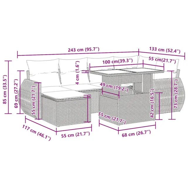 Ta vrtna sedežna garnitura je popoln dodatek za vaše dvorišče, teraso ali verando, saj zagotavlja udoben in vabljiv prostor za klepet z družino in prijatelji ali preprosto za sprostitev in uživanje na prostem. Trpežen material: PE ratan, znan tudi kot poli ratan, je močan sintetični material, ki ne potrebuje vzdrževanja in je videti kot naravni ratan. Je lahek, enostaven za čiščenje in se zaradi svoje vzdržljivosti in odpornosti na vremenske vplive pogosto uporablja za zunanje pohištvo.Funkcija shranjevanja z vodoodporno vrečo: Vsak vrtni sedež ima pod sedežem prostor za shranjevanje, opremljen z vodoodporno vrečo za shranjevanje blazin, igrač in drugih predmetov. Notranja torba ima zgornji pokrov in jo je mogoče varno pritrditi na sedež s kavljem in zanko za večjo stabilnost.Nastavljiva mizna plošča: Z dvigom mizne plošče lahko mizo povišate, s čimer se zunanja klubska mizica spremeni v jedilno mizo. Popolna je za sprejemanje gostov ali uživanje v obrokih na prostem.Vsestranski stolček za noge: Stolček je vsestransko uporaben, saj služi kot udoben naslon za noge, ko ležite na kavču, ali kot dodaten sedež na vrtu.Prevleko je mogoče odstraniti in oprati: Te sedežne blazine imajo odstranljive prevleke za lažje pranje in vzdrževanje.Robusten in stabilen okvir: Jeklen okvir s prašnim premazom je močan, stabilen, trpežen ter odporen na korozijo in slabe vremenske razmere, kar zagotavlja dolgotrajno delovanje. Dobro je vedeti:Če želite, da vaše zunanje pohištvo ostane lepo, vam priporočamo, da ga zaščitite z vodoodporno prevleko.Dimenzije vodoodporne vreče: 55 x 53 x 34 cm (D x Š x V)Največja dovoljena teža (na sedež): 110 kgUV-odpornoPlastične nastavljive nogePotrebno sestavljanje: DaSrednji sedež:Barva: BežMaterial: PE ratan, jeklen okvir s prašnim premazomDimenzije: 55 x 62 x 69 cm (Š x G x V)Velikost sedeža: 55 x 55 cm (Š x G)Višina sedeža od tal (brez blazine): 37 cmKotni sedež:Barva: BežMaterial: PE ratan, jeklen okvir s prašnim premazomDimenzije: 62 x 62 x 69 cm (Š x G x V)Velikost sedeža: 55 x 55 cm (Š x G)Višina sedeža od tal (brez blazine): 37 cmKavč z naslonjali za roke:Barva: BežMaterial: PE ratan, jeklen okvir s prašnim premazomDimenzije: 71 x 62 x 69 cm (Š x G x V)Velikost sedeža: 55 x 55 cm (Š x G)Višina sedeža od tal (brez blazine): 37 cmVišina naslonjal za roke od tal: 55 cmStolček za noge:Barva: BežMaterial: PE ratan, jeklen okvir s prašnim premazomDimenzije: 55 x 55 x 37 cm (Š x G x V)Miza:Barva: BežMaterial: PE ratan, jeklo s prašnim premazom, kaljeno stekloDimenzije: 100 x 55 x 44/73 cm (D x Š x V)Blazina:Barva: Kremno belaMaterial prevleke: Tkanina (100 % poliester)Polnilo sedežne blazine: PenaPolnilo hrbtne blazine: bombažna vlaknaDimenzije sedežne blazine: 55 x 55 x 3 cm (Š x G x D)Dimenzije hrbtne blazine: 55 x 45 x 13 cm (D x Š x D)Paket vsebuje:2 x Srednji kavč s funkcijo shranjevanja z vodoodporno vrečo1 x Kotni kavč s funkcijo shranjevanja z vodoodporno vrečo2 x Kavč s funkcijo shranjevanja z vodoodporno vrečo1 x Stolček za noge s funkcijo shranjevanja z vodoodporno vrečo1 x Miza6 x Blazina za hrbet6 x Sedežna blazina s snemljivo pralno prevleko 3326669