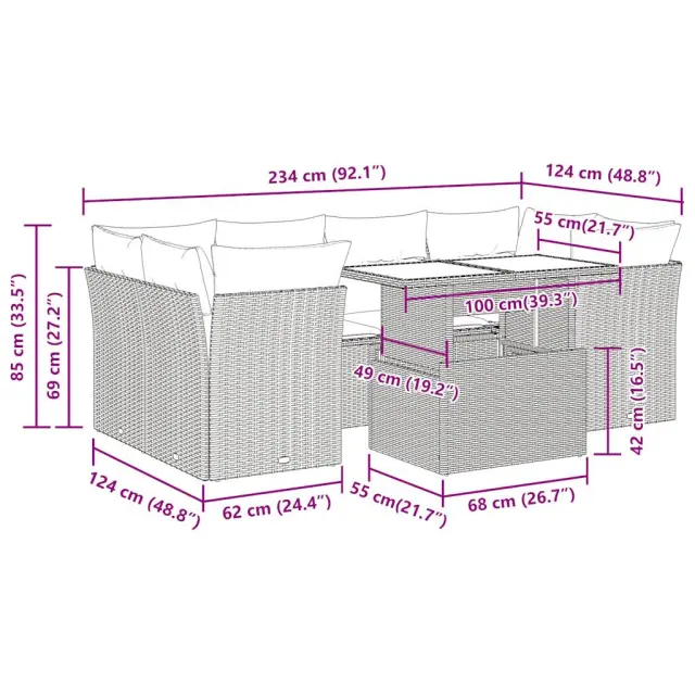 Ta vrtna sedežna garnitura je popoln dodatek za vaše dvorišče, teraso ali verando, saj zagotavlja udoben in vabljiv prostor za klepet z družino in prijatelji ali preprosto za sprostitev in uživanje na prostem. Trpežen material: PE ratan, znan tudi kot poli ratan, je močan sintetični material, ki ne potrebuje vzdrževanja in je videti kot naravni ratan. Je lahek, enostaven za čiščenje in se zaradi svoje vzdržljivosti in odpornosti na vremenske vplive pogosto uporablja za zunanje pohištvo.Funkcija shranjevanja z vodoodporno vrečo: Vsak vrtni sedež ima pod sedežem prostor za shranjevanje, opremljen z vodoodporno vrečo za shranjevanje blazin, igrač in drugih predmetov. Notranja torba ima zgornji pokrov in jo je mogoče varno pritrditi na sedež s kavljem in zanko za večjo stabilnost.Nastavljiva mizna plošča: Z dvigom mizne plošče lahko mizo povišate, s čimer se zunanja klubska mizica spremeni v jedilno mizo. Popolna je za sprejemanje gostov ali uživanje v obrokih na prostem.Prevleko je mogoče odstraniti in oprati: Te sedežne blazine imajo odstranljive prevleke za lažje pranje in vzdrževanje.Robusten in stabilen okvir: Jeklen okvir s prašnim premazom je močan, stabilen, trpežen ter odporen na korozijo in slabe vremenske razmere, kar zagotavlja dolgotrajno delovanje. Dobro je vedeti:Če želite, da vaše zunanje pohištvo ostane lepo, vam priporočamo, da ga zaščitite z vodoodporno prevleko.Dimenzije vodoodporne vreče: 55 x 53 x 34 cm (D x Š x V)Največja dovoljena teža (na sedež): 110 kgUV-odpornoPlastične nastavljive nogePotrebno sestavljanje: DaSrednji sedež:Barva: ČrnaMaterial: PE ratan, jeklen okvir s prašnim premazomDimenzije: 55 x 62 x 69 cm (Š x G x V)Velikost sedeža: 55 x 55 cm (Š x G)Višina sedeža od tal (brez blazine): 37 cmKotni sedež:Barva: ČrnaMaterial: PE ratan, jeklen okvir s prašnim premazomDimenzije: 62 x 62 x 69 cm (Š x G x V)Velikost sedeža: 55 x 55 cm (Š x G)Višina sedeža od tal (brez blazine): 37 cmMiza:Barva: ČrnaMaterial: PE ratan, jeklo s prašnim premazom, kaljeno stekloDimenzije: 100 x 55 x 44/73 cm (D x Š x V)Blazina:Barva: Kremno belaMaterial prevleke: Tkanina (100 % poliester)Polnilo sedežne blazine: PenaPolnilo hrbtne blazine: bombažna vlaknaDimenzije sedežne blazine: 55 x 55 x 3 cm (Š x G x D)Dimenzije hrbtne blazine: 55 x 45 x 13 cm (D x Š x D)Paket vsebuje:2 x Srednji kavč s funkcijo shranjevanja z vodoodporno vrečo4 x Kotni sedež s funkcijo shranjevanja z vodoodporno vrečo1 x Miza10 x Blazina za hrbet6 x Sedežna blazina s snemljivo pralno prevleko 3326107