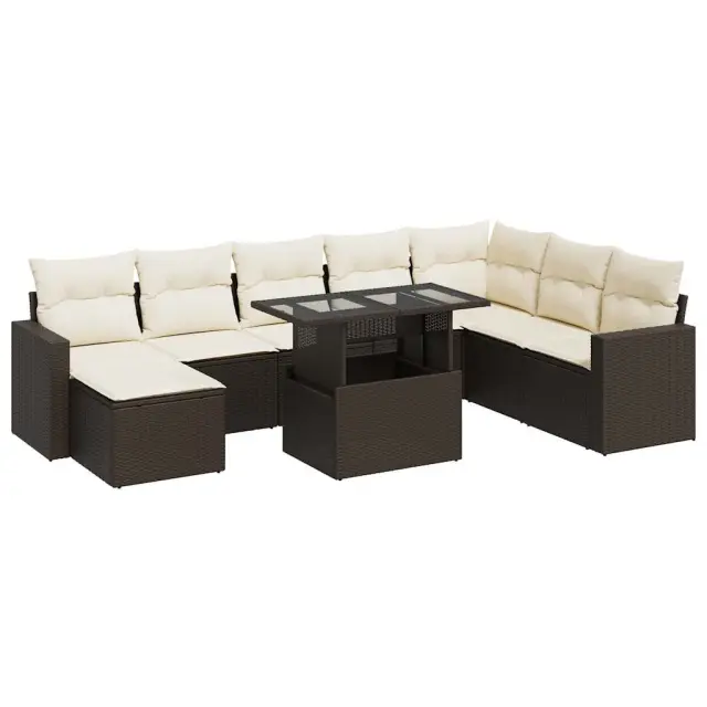 Ta vrtna sedežna garnitura je popoln dodatek za vaše dvorišče, teraso ali verando, saj zagotavlja udoben in vabljiv prostor za klepet z družino in prijatelji ali preprosto za sprostitev in uživanje na prostem. Trpežen material: PE ratan, znan tudi kot poli ratan, je močan sintetični material, ki ne potrebuje vzdrževanja in je videti kot naravni ratan. Je lahek, enostaven za čiščenje in se zaradi svoje vzdržljivosti in odpornosti na vremenske vplive pogosto uporablja za zunanje pohištvo.Funkcija shranjevanja z vodoodporno vrečo: Vsak vrtni sedež ima pod sedežem prostor za shranjevanje, opremljen z vodoodporno vrečo za shranjevanje blazin, igrač in drugih predmetov. Notranja torba ima zgornji pokrov in jo je mogoče varno pritrditi na sedež s kavljem in zanko za večjo stabilnost.Nastavljiva mizna plošča: Z dvigom mizne plošče lahko mizo povišate, s čimer se zunanja klubska mizica spremeni v jedilno mizo. Popolna je za sprejemanje gostov ali uživanje v obrokih na prostem.Vsestranski stolček za noge: Stolček je vsestransko uporaben, saj služi kot udoben naslon za noge, ko ležite na kavču, ali kot dodaten sedež na vrtu.Prevleko je mogoče odstraniti in oprati: Te sedežne blazine imajo odstranljive prevleke za lažje pranje in vzdrževanje.Robusten in stabilen okvir: Jeklen okvir s prašnim premazom je močan, stabilen, trpežen ter odporen na korozijo in slabe vremenske razmere, kar zagotavlja dolgotrajno delovanje. Dobro je vedeti:Če želite, da vaše zunanje pohištvo ostane lepo, vam priporočamo, da ga zaščitite z vodoodporno prevleko.Dimenzije vodoodporne vreče: 55 x 53 x 34 cm (D x Š x V)Največja dovoljena teža (na sedež): 110 kgUV-odpornoPlastične nastavljive nogePotrebno sestavljanje: DaSrednji sedež:Barva: RjavaMaterial: PE ratan, jeklen okvir s prašnim premazomDimenzije: 55 x 62 x 69 cm (Š x G x V)Velikost sedeža: 55 x 55 cm (Š x G)Višina sedeža od tal (brez blazine): 37 cmKotni sedež:Barva: RjavaMaterial: PE ratan, jeklen okvir s prašnim premazomDimenzije: 62 x 62 x 69 cm (Š x G x V)Velikost sedeža: 55 x 55 cm (Š x G)Višina sedeža od tal (brez blazine): 37 cmKavč z naslonjali za roke:Barva: RjavaMaterial: PE ratan, jeklen okvir s prašnim premazomDimenzije: 65,5 x 62 x 69 cm (Š x G x V)Velikost sedeža: 55 x 55 cm (Š x G)Višina sedeža od tal (brez blazine): 37 cmVišina naslonjal za roke od tal: 55 cmStolček za noge:Barva: RjavaMaterial: PE ratan, jeklen okvir s prašnim premazomDimenzije: 55 x 55 x 37 cm (Š x G x V)Miza:Barva: RjavaMaterial: PE ratan, jeklo s prašnim premazom, kaljeno stekloDimenzije: 100 x 55 x 44/73 cm (D x Š x V)Blazina:Barva: Kremno belaMaterial prevleke: Tkanina (100 % poliester)Polnilo sedežne blazine: PenaPolnilo hrbtne blazine: bombažna vlaknaDimenzije sedežne blazine: 55 x 55 x 3 cm (Š x G x D)Dimenzije hrbtne blazine: 55 x 45 x 13 cm (D x Š x D)Paket vsebuje:4 x Srednji kavč s funkcijo shranjevanja z vodoodporno vrečo1 x Kotni kavč s funkcijo shranjevanja z vodoodporno vrečo2 x Kavč s funkcijo shranjevanja z vodoodporno vrečo1 x Stolček za noge s funkcijo shranjevanja z vodoodporno vrečo1 x Miza8 x Blazina za hrbet8 x Sedežna blazina s snemljivo in pralno prevleko 3326374