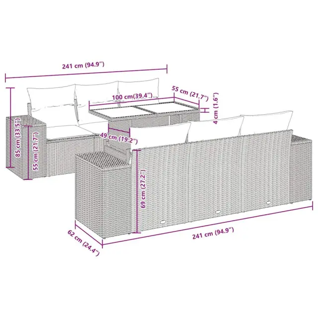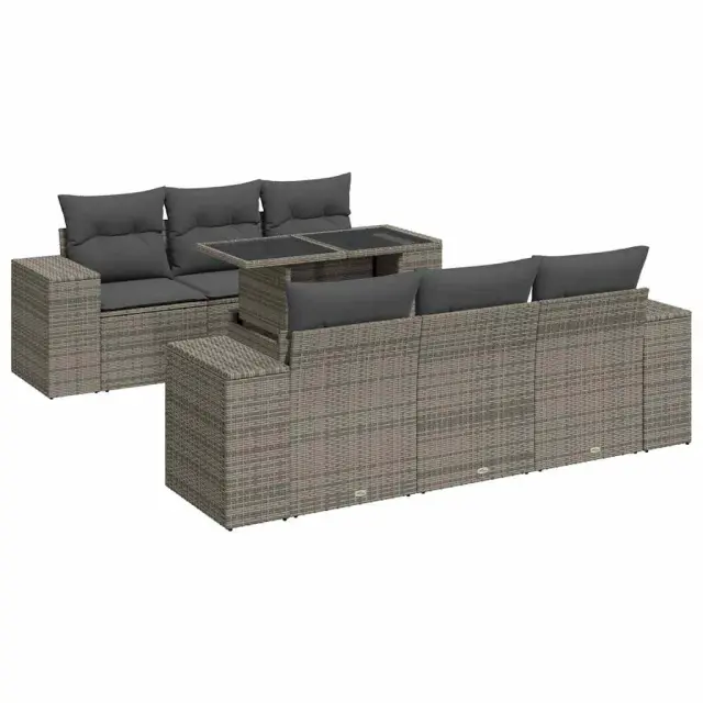 Ta vrtna sedežna garnitura je popoln dodatek za vaše dvorišče, teraso ali verando, saj zagotavlja udoben in vabljiv prostor za klepet z družino in prijatelji ali preprosto za sprostitev in uživanje na prostem. Trpežen material: PE ratan, znan tudi kot poli ratan, je močan sintetični material, ki ne potrebuje vzdrževanja in je videti kot naravni ratan. Je lahek, enostaven za čiščenje in se zaradi svoje vzdržljivosti in odpornosti na vremenske vplive pogosto uporablja za zunanje pohištvo.Funkcija shranjevanja z vodoodporno torbo: Vrtno pohištvo ima pod sedežem prostor za shranjevanje, opremljen z vodoodporno torbo za shranjevanje blazin, igrač in drugih stvari. Notranjo torbo je mogoče varno pritrditi na zunanje pohištvo s kavljem in zanko za večjo stabilnost.Nastavljiva mizna plošča: Z dvigom mizne plošče lahko mizo povišate, s čimer se zunanja klubska mizica spremeni v jedilno mizo. Popolna je za sprejemanje gostov ali uživanje v obrokih na prostem.Prevleko je mogoče odstraniti in oprati: Te sedežne blazine imajo odstranljive prevleke za lažje pranje in vzdrževanje.Modularna zasnova: Ta komplet zunanjega pohištva ima modularno zasnovo, zaradi česar je popolnoma prilagodljiv in enostaven za premikanje, tako da lahko zunanjo garnituro postavite kakor koli želite. Dobro je vedeti:Če želite, da vaše zunanje pohištvo ostane lepo, vam priporočamo, da ga zaščitite z vodoodporno prevleko.Dimenzije vodoodporne vreče: 55 x 53 x 34 cm (D x Š x V)Maksimalna nosilnost (na sedež): 110 kgUV-odpornoPlastične nastavljive nogePotrebno sestavljanje: DaKotni sedež:Barva: SivaMaterial: PE ratan, jeklen okvir s prašnim premazomDimenzije: 83 x 62 x 69 cm (Š x G x V)Velikost sedeža: 55 x 55 cm (Š x G)Višina sedeža od tal (brez blazine): 37 cmVišina naslonjal za roke od tal: 55 cmŠirina naslona za roke: 27,5 cmSrednji sedež:Barva: SivaMaterial: PE ratan, jeklen okvir s prašnim premazomDimenzije: 55 x 62 x 69 cm (Š x G x V)Velikost sedeža: 55 x 55 cm (Š x G)Višina sedeža od tal (brez blazine): 37 cmMiza:Barva: SivaMaterial: PE ratan, jeklo s prašnim premazom, kaljeno stekloDimenzije: 100 x 55 x 44/73 cm (D x Š x V)Blazina:Barva: Temno sivaMaterial prevleke: Tkanina (100 % poliester)Polnilo sedežne blazine: PenaPolnilo hrbtne blazine: bombažna vlaknaDimenzije sedežne blazine: 55 x 55 x 3 cm (Š x G x D)Dimenzije hrbtne blazine: 55 x 45 x 13 cm (D x Š x D)Paket vsebuje:1 x Vrtna miza4 x Kotni sedež s funkcijo shranjevanja z vodoodporno vrečo2 x Srednji kavč s funkcijo shranjevanja z vodoodporno vrečo6 x Blazina za hrbet6 x Sedežna blazina s snemljivo pralno prevleko 3326741