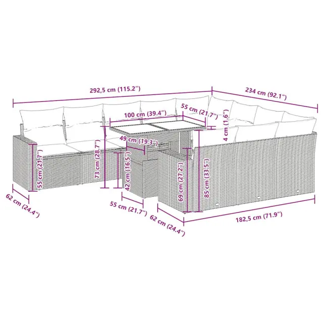 Ta vrtna sedežna garnitura je popoln dodatek za vaše dvorišče, teraso ali verando, saj zagotavlja udoben in vabljiv prostor za klepet z družino in prijatelji ali preprosto za sprostitev in uživanje na prostem. Trpežen material: PE ratan, znan tudi kot poli ratan, je močan sintetični material, ki ne potrebuje vzdrževanja in je videti kot naravni ratan. Je lahek, enostaven za čiščenje in se zaradi svoje vzdržljivosti in odpornosti na vremenske vplive pogosto uporablja za zunanje pohištvo.Funkcija shranjevanja z vodoodporno vrečo: Vsak vrtni sedež ima pod sedežem prostor za shranjevanje, opremljen z vodoodporno vrečo za shranjevanje blazin, igrač in drugih predmetov. Notranja torba ima zgornji pokrov in jo je mogoče varno pritrditi na sedež s kavljem in zanko za večjo stabilnost.Nastavljiva mizna plošča: Z dvigom mizne plošče lahko mizo povišate, s čimer se zunanja klubska mizica spremeni v jedilno mizo. Popolna je za sprejemanje gostov ali uživanje v obrokih na prostem.Prevleko je mogoče odstraniti in oprati: Te sedežne blazine imajo odstranljive prevleke za lažje pranje in vzdrževanje.Robusten in stabilen okvir: Jeklen okvir s prašnim premazom je močan, stabilen, trpežen ter odporen na korozijo in slabe vremenske razmere, kar zagotavlja dolgotrajno delovanje. Dobro je vedeti:Če želite, da vaše zunanje pohištvo ostane lepo, vam priporočamo, da ga zaščitite z vodoodporno prevleko.Dimenzije vodoodporne vreče: 55 x 53 x 34 cm (D x Š x V)Največja dovoljena teža (na sedež): 110 kgUV-odpornoPlastične nastavljive nogePotrebno sestavljanje: DaSrednji sedež:Barva: BežMaterial: PE ratan, jeklen okvir s prašnim premazomDimenzije: 55 x 62 x 69 cm (Š x G x V)Velikost sedeža: 55 x 55 cm (Š x G)Višina sedeža od tal (brez blazine): 37 cmKotni sedež:Barva: BežMaterial: PE ratan, jeklen okvir s prašnim premazomDimenzije: 62 x 62 x 69 cm (Š x G x V)Velikost sedeža: 55 x 55 cm (Š x G)Višina sedeža od tal (brez blazine): 37 cmKavč z naslonjali za roke:Barva: BežMaterial: PE ratan, jeklen okvir s prašnim premazomDimenzije: 65,5 x 62 x 69 cm (Š x G x V)Velikost sedeža: 55 x 55 cm (Š x G)Višina sedeža od tal (brez blazine): 37 cmVišina naslonjal za roke od tal: 55 cmMiza:Barva: BežMaterial: PE ratan, jeklo s prašnim premazom, kaljeno stekloDimenzije: 100 x 55 x 44/73 cm (D x Š x V)Blazina:Barva: Kremno belaMaterial prevleke: Tkanina (100 % poliester)Polnilo sedežne blazine: PenaPolnilo hrbtne blazine: bombažna vlaknaDimenzije sedežne blazine: 55 x 55 x 3 cm (Š x G x D)Dimenzije hrbtne blazine: 55 x 45 x 13 cm (D x Š x D)Paket vsebuje:6 x Srednji kavč s funkcijo shranjevanja z vodoodporno vrečo2 x Kotni kavč s funkcijo shranjevanja z vodoodporno vrečo2 x Kavč s funkcijo shranjevanja z vodoodporno vrečo1 x Miza12 x Blazina za hrbet10 x Sedežna blazina s snemljivo in pralno prevleko 3326389