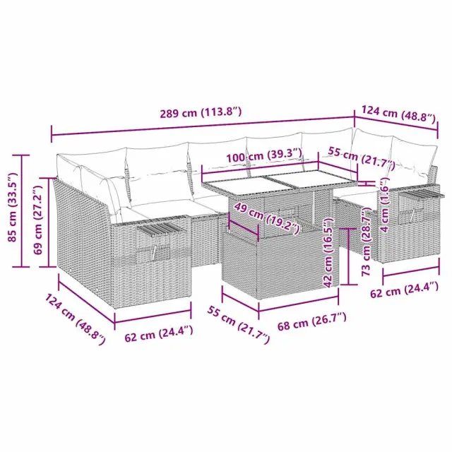 Ta vrtna sedežna garnitura je popoln dodatek za vaše dvorišče, teraso ali verando, saj zagotavlja udoben in vabljiv prostor za klepet z družino in prijatelji ali preprosto za sprostitev in uživanje na prostem. Trpežen material: PE ratan, znan tudi kot poli ratan, je močan sintetični material, ki ne potrebuje vzdrževanja in je videti kot naravni ratan. Je lahek, enostaven za čiščenje in se zaradi svoje vzdržljivosti in odpornosti na vremenske vplive pogosto uporablja za zunanje pohištvo.Funkcija shranjevanja z vodoodporno vrečo: Vsak vrtni sedež ima pod sedežem prostor za shranjevanje, opremljen z vodoodporno vrečo za shranjevanje blazin, igrač in drugih predmetov. Notranja torba ima zgornji pokrov in jo je mogoče varno pritrditi na sedež s kavljem in zanko za večjo stabilnost.Nastavljiva mizna plošča: Z dvigom mizne plošče lahko mizo povišate, s čimer se zunanja klubska mizica spremeni v jedilno mizo. Popolna je za sprejemanje gostov ali uživanje v obrokih na prostem.Prevleko je mogoče odstraniti in oprati: Te sedežne blazine imajo odstranljive prevleke za lažje pranje in vzdrževanje.Robusten in stabilen okvir: Jeklen okvir s prašnim premazom je močan, stabilen, trpežen ter odporen na korozijo in slabe vremenske razmere, kar zagotavlja dolgotrajno delovanje. Dobro je vedeti:Če želite, da vaše zunanje pohištvo ostane lepo, vam priporočamo, da ga zaščitite z vodoodporno prevleko.Dimenzije vodoodporne vreče: 55 x 53 x 34 cm (D x Š x V)Največja dovoljena teža (na sedež): 110 kgUV-odpornoPlastične nastavljive nogePotrebno sestavljanje: DaSrednji sedež:Barva: ČrnaMaterial: PE ratan, jeklen okvir s prašnim premazomDimenzije: 55 x 62 x 69 cm (Š x G x V)Velikost sedeža: 55 x 55 cm (Š x G)Višina sedeža od tal (brez blazine): 37 cmKotni sedež:Barva: ČrnaMaterial: PE ratan, jeklen okvir s prašnim premazomDimenzije: 62 x 62 x 69 cm (Š x G x V)Velikost sedeža: 55 x 55 cm (Š x G)Višina sedeža od tal (brez blazine): 37 cmKavč z naslonjali za roke:Barva: ČrnaMaterial: PE ratan, jeklen okvir s prašnim premazomDimenzije: 62 x 62 x 69 cm (Š x G x V)Velikost sedeža: 55 x 55 cm (Š x G)Višina sedeža od tal (brez blazine): 37 cmVišina naslonjal za roke od tal: 55 cmMiza:Barva: ČrnaMaterial: PE ratan, jeklo s prašnim premazom, kaljeno stekloDimenzije: 100 x 55 x 44/73 cm (D x Š x V)Blazina:Barva: ČrnaMaterial prevleke: Tkanina (100 % poliester)Polnilo sedežne blazine: PenaPolnilo hrbtne blazine: bombažna vlaknaDimenzije sedežne blazine: 55 x 55 x 3 cm (Š x G x D)Dimenzije hrbtne blazine: 55 x 45 x 13 cm (D x Š x D)Paket vsebuje:3 x Srednji kavč s funkcijo shranjevanja z vodoodporno vrečo2 x Kotni kavč s funkcijo shranjevanja z vodoodporno vrečo2 x Kavč s funkcijo shranjevanja z vodoodporno vrečo1 x Miza9 x Blazina za hrbet7 x Sedežna blazina s snemljivo in pralno prevleko 3326436