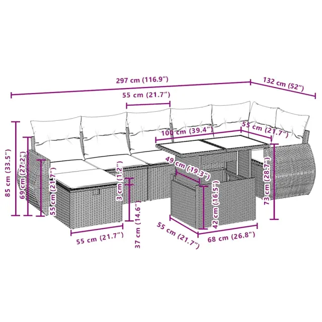 Ta vrtna sedežna garnitura je popoln dodatek za vaše dvorišče, teraso ali verando, saj zagotavlja udoben in vabljiv prostor za klepet z družino in prijatelji ali preprosto za sprostitev in uživanje na prostem. Vzdržljiv material: PE ratan, znan tudi kot poli ratan, je močan sintetični material, ki zahteva malo vzdrževanja in je videti kot naravni ratan. Je lahek, enostaven za čiščenje in se zaradi svoje vzdržljivosti in odpornosti na vremenske vplive pogosto uporablja za zunanje pohištvo.Nastavljiva mizna plošča: Z dvigom mizne plošče lahko mizo povišate, s čimer se zunanja klubska mizica spremeni v jedilno mizo. Popolna je za sprejemanje gostov ali uživanje v obrokih na prostem.Steklena mizna plošča: Površina zunanje mize je izdelana iz močnega in trpežnega kaljenega stekla, kar omogoča enostavno čiščenje z vlažno krpo in vašemu zunanjemu prostoru doda pridih elegance.Prevleko je mogoče odstraniti in oprati: Te sedežne blazine imajo odstranljive prevleke za lažje pranje in vzdrževanje.Modularna zasnova: Ta komplet zunanjega pohištva ima modularno zasnovo, zaradi česar je popolnoma prilagodljiv in enostaven za premikanje, tako da lahko zunanjo garnituro postavite kakor koli želite. Dobro je vedeti:Če želite, da vaše zunanje pohištvo ostane lepo, vam priporočamo, da ga zaščitite z vodoodporno prevleko.Maksimalna nosilnost (na sedež): 110 kgUV-odpornoPlastične nastavljive nogePotrebno sestavljanje: DaKotni kavč:Barva: RjavaMaterial: PE ratan, jeklen okvir s prašnim premazomDimenzije: 62 x 62 x 69 cm (Š x G x V)Velikost sedeža: 55 x 55 cm (Š x G)Višina sedeža od tal (brez blazine): 37 cmSredinski kavč:Barva: RjavaMaterial: PE ratan, jeklen okvir s prašnim premazomDimenzije: 55 x 62 x 69 cm (Š x G x V)Velikost sedeža: 55 x 55 cm (Š x G)Višina sedeža od tal (brez blazine): 37 cmKavč z naslonjali za roke:Barva: RjavaMaterial: PE ratan, jeklen okvir s prašnim premazomDimenzije: 70 x 62 x 69 cm (Š x G x V)Velikost sedeža: 55 x 55 cm (Š x G)Višina sedeža od tal (brez blazine): 37 cmVišina naslonjal za roke od tal: 55 cmMiza:Barva: RjavaMaterial: PE ratan, jeklo s prašnim premazom, kaljeno stekloDimenzije: 100 x 55 x 44/73 cm (D x Š x V)Stolček:Barva: RjavaMaterial: PE ratan, jeklen okvir s prašnim premazomDimenzije: 55 x 55 x 37 cm (Š x G x V)Blazina:Barva: Kremno belaMaterial prevleke: Tkanina (100 % poliester)Polnilo sedežne blazine: PenaPolnilo hrbtne blazine: bombažna vlaknaDimenzije sedežne blazine: 55 x 55 x 3 cm (Š x G x D)Dimenzije hrbtne blazine: 55 x 45 x 13 cm (D x Š x D)Paket vsebuje:1 x Kotni sedež3 x Srednji sedež2 x Kavč z naslonjali za roke1 x Vrtni stolček s funkcijo shranjevanja1 x Vrtna miza7 x Hrbtna blazina7 x Sedežna blazina s snemljivo in pralno prevleko 3275153