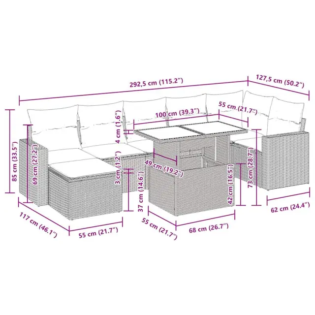 vidaXL Vrtna sedežna garnitura 8-delna z blazinami sv. siv poli ratan